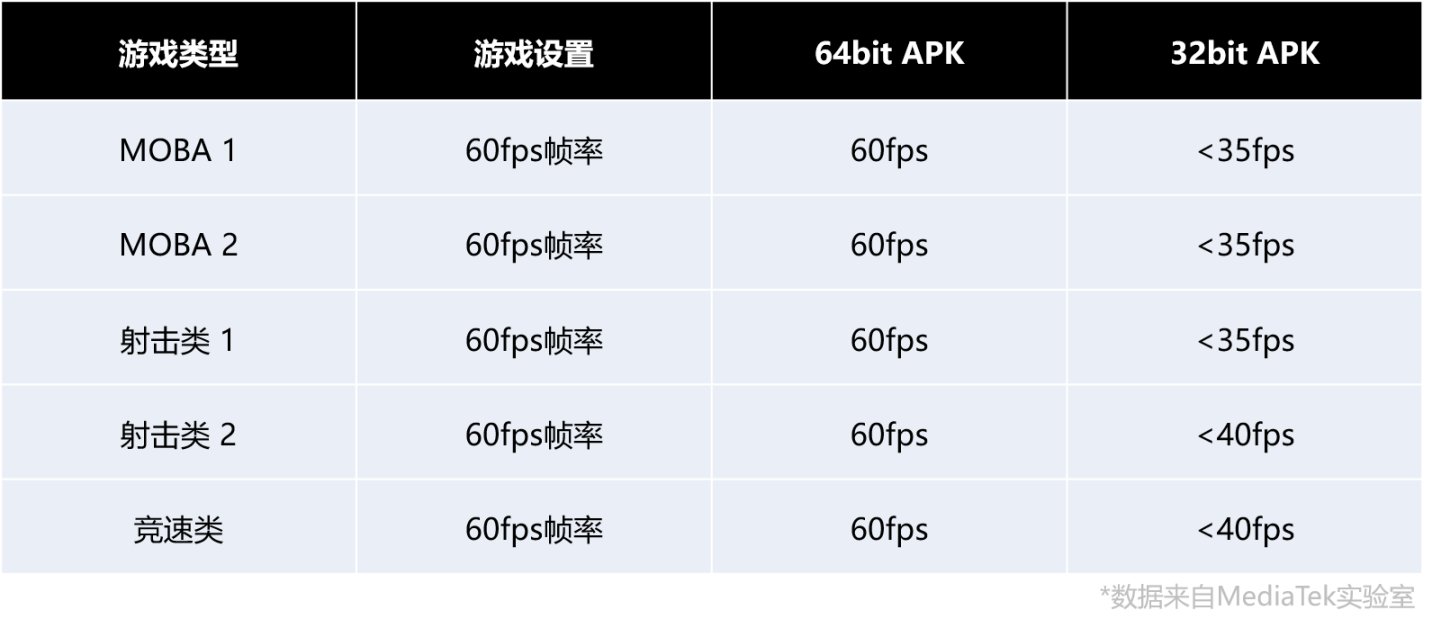 这个我们需要用同一CPU下运行不同版本的APK,通过MediaTek实验室的实验数据,基于不同IP的移动SoC测试结果表明:32位和64位相比有30%-40%的体验差异,64位应用能带给手机玩家更加丝滑流畅的游戏体验。