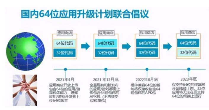 于是2021年底,国内安卓五大应用商店,共同宣布了将会推进国内安卓生态对于64位应用的支持。