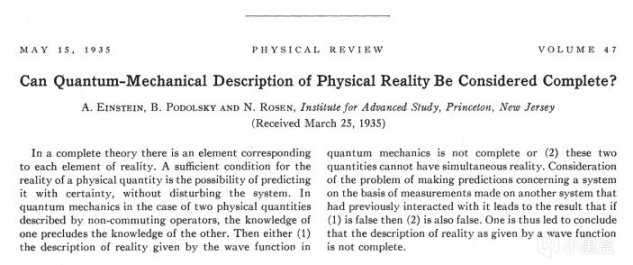 “量子力學對物理實在的描述能被認爲是完備的嗎?”愛因斯坦1905年功成名就後再開猛炮,質疑量子力學的完備性,假若定域實在論成立,則可以推導出量子力學的不完備性。即兩個粒子相互作用後分開,對其中一個粒子的測量會影響另一個粒子的情況,愛因斯坦稱其爲“幽靈般的超距作用”。