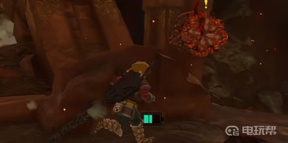 7、我们回到刚才小车停车的位置,然后攻击右侧的机关可以放行,然后我们启动轨道车就能前往火之神殿2F。