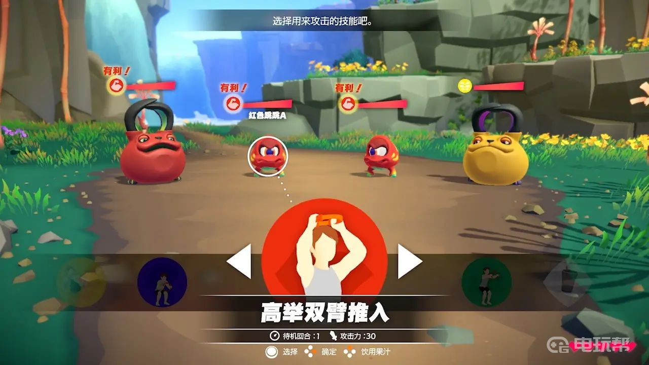 玩家首先需要确定腹肌防御是否成功,成功的话会出现best字样,然后建议玩家使用菠菜汁才能够不掉血。玩家根据游戏画面的指示,把健身环往腹肌上面进行挤压就能进行防御。