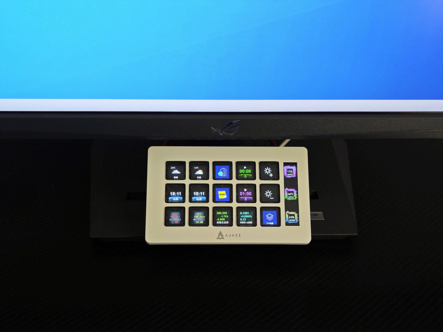 黑爵AKP153桌面控制檯左邊爲按鍵區域,擁有15個Switch Blade按鍵,通過配套的軟件可以對這些按鍵的功能進行自定義,而且還支持翻頁操作,總共可以自定義四個屏幕,分別是信息看板、常用網站、WINDOWS控制、音樂控制檯,信息看板作爲第一屏我們可以定義常用的功能,比如:天氣、股票情況、備忘錄、常用軟件的各種快捷鍵等等,重要信息一目瞭然,輕輕一按就可以實現各種快捷操作,簡直是桌面神器,此外所有圖標還可以自己定義,輕鬆打造專屬桌搭氛圍。