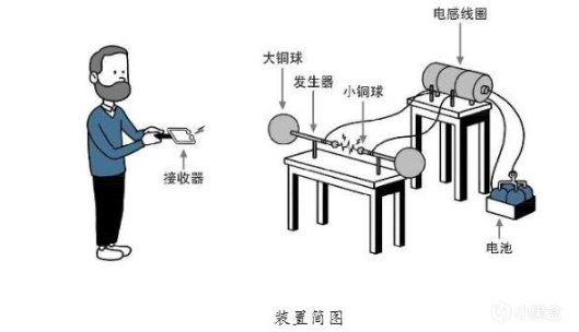 彼時這個坐落於萊茵河東岸的德意志城市,在俾斯麥手上得以復興,一位年輕的講師海因裏希·魯道夫·赫茲,受老師赫爾姆霍茲的啓發,正在卡爾斯魯厄大學實驗室裏埋頭研究電磁理論,當時德國物理屆認爲電力與磁力可瞬時傳送,赫茲自己做了一套電磁波發生器,每當發生器火花放電時,在兩個銅球間會產生一個振盪的電場,並引發一個向外傳播的電磁波。