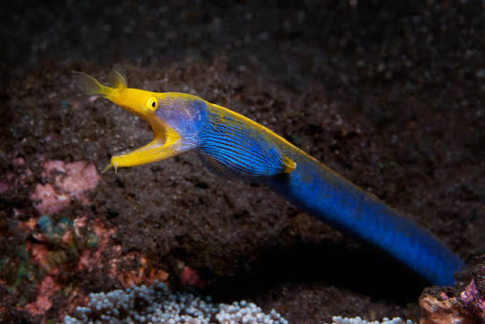管鼻鯙是很神祕的物種,主要在夜間活動。一天中四分之三的時間都會隱藏在洞穴中,偶爾只把頭露出來看看周圍是否有獵物。