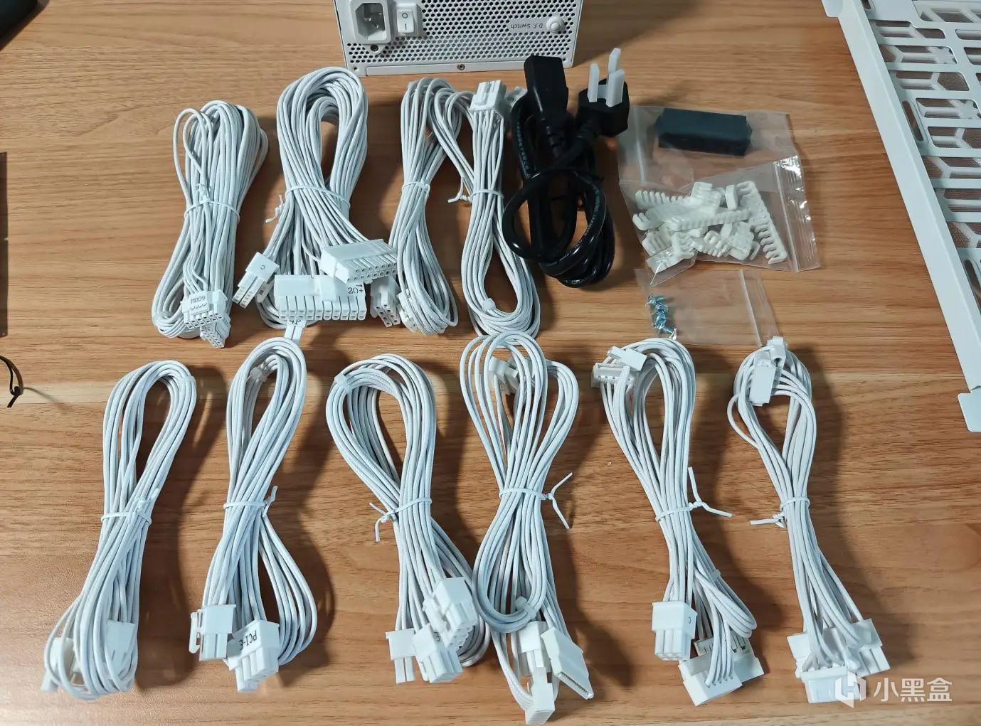 这款电源配备了白色的模组线,不仅线材本身,接头也是白色的,好评。而且选用了柔软的压纹模组线材,这种线更加柔软,理线和走线更加容易,我喜欢。
