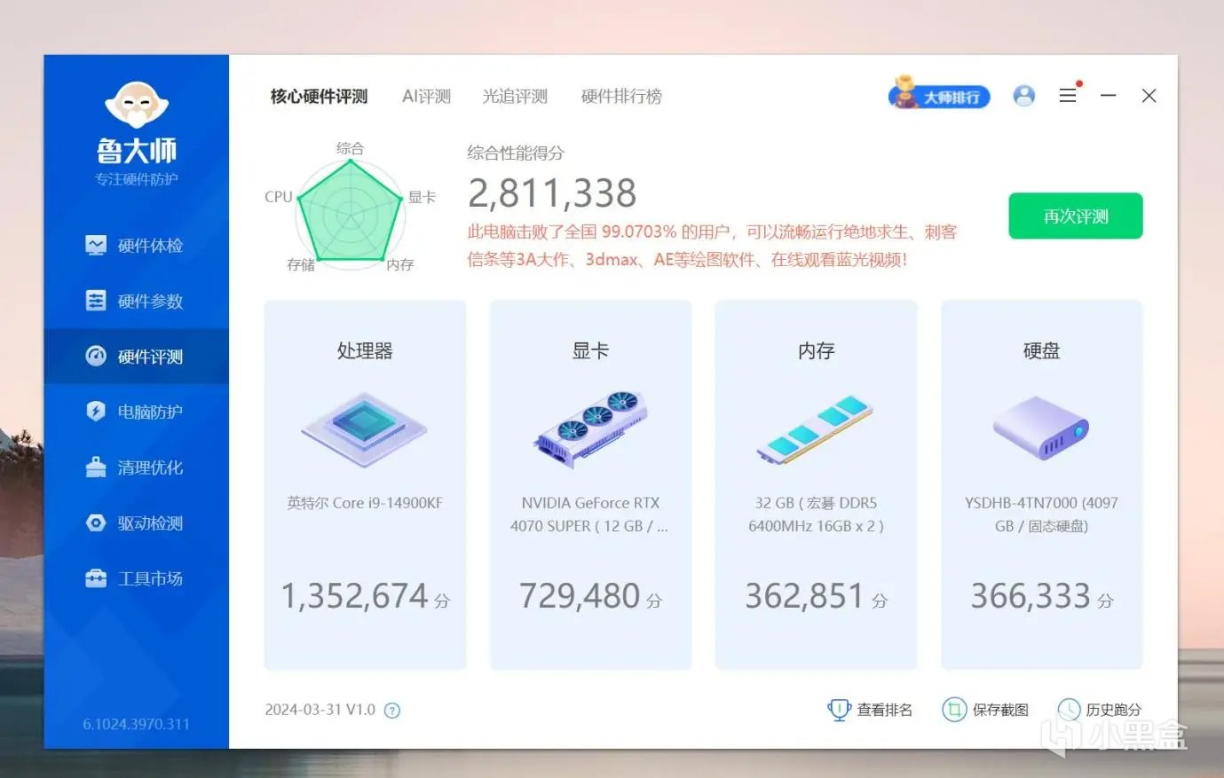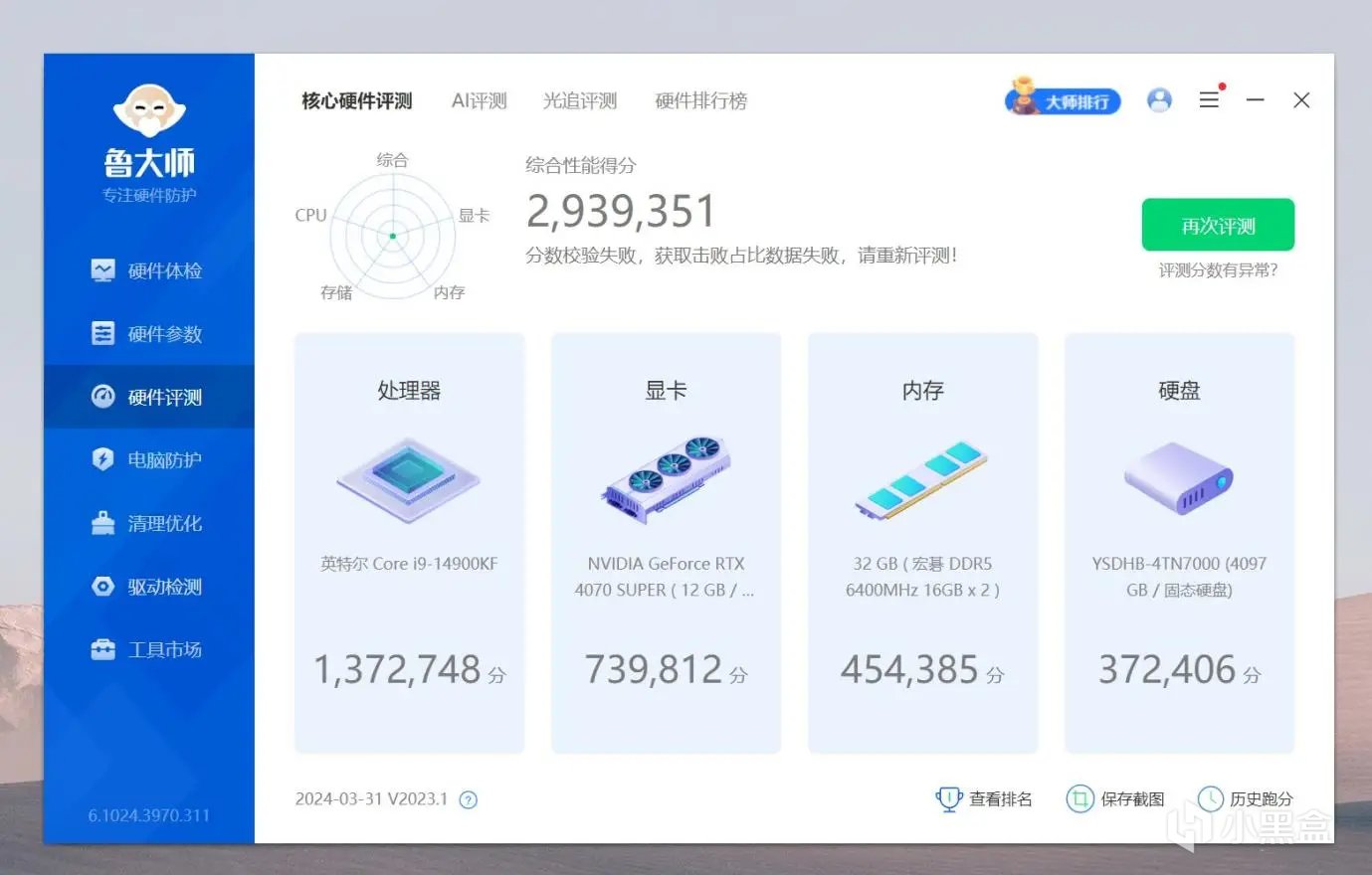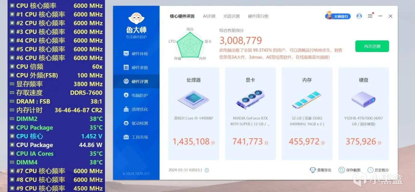 运行鲁大师,总分提升到了293.9万分,内存提升到了45.4万,提升巨大。由于内存性能的提升,CPU的性能也得到助力,分数也有所上升。