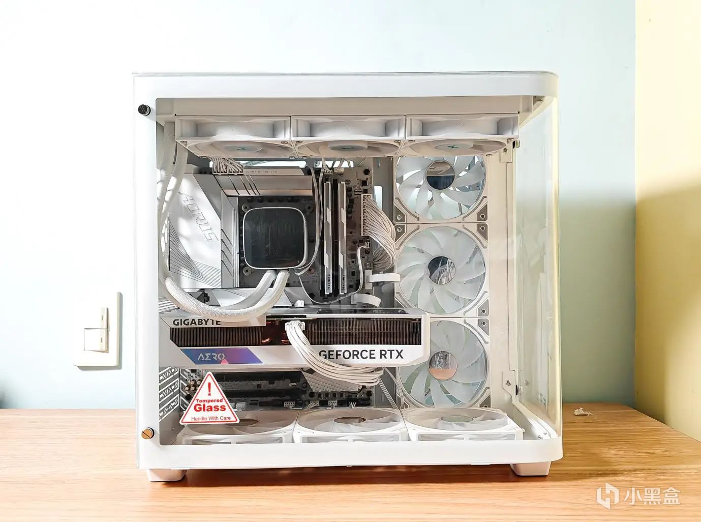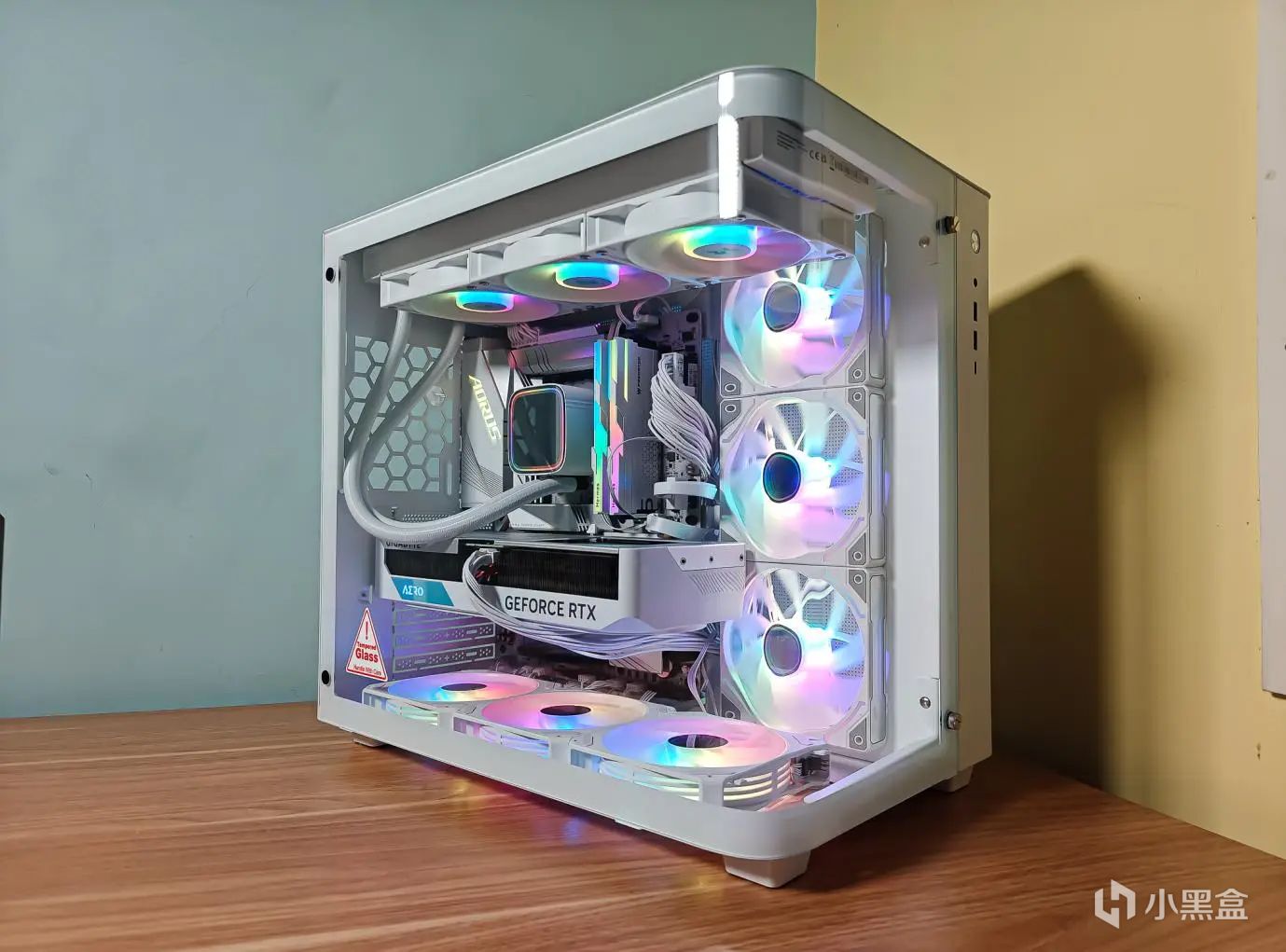 看,就是上图的这款新装的电脑,白色机箱、白色风扇、白色水冷、白色显卡、白色主板、白色内存、白色电源,一白到底,加上RGB彩光,是不是更清爽?而且你看着机箱内部一览无余,其实外面是有一层玻璃的,曲面玻璃,但很通透,看不出来是不是。