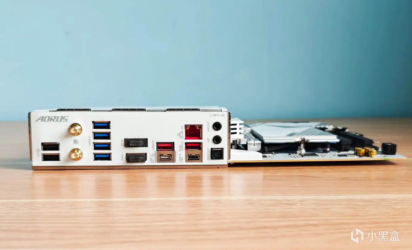 主板的一体式IO板接口接口丰富,支持各种使用。包括有2个USB 2.0接口,4个USB 3.2 Gen 1 TYPE-A(蓝色),2个USB 3.2 Gen2 TYPE-A(红色) ,1个USB 3.2 Gen2 TYPE-C,一个USB 3.2 Gen 2x2 TYPE-C接口,还有速率高达5Gbps的有线网络接口和WiFi 7无线网卡接口,以及音响接口。