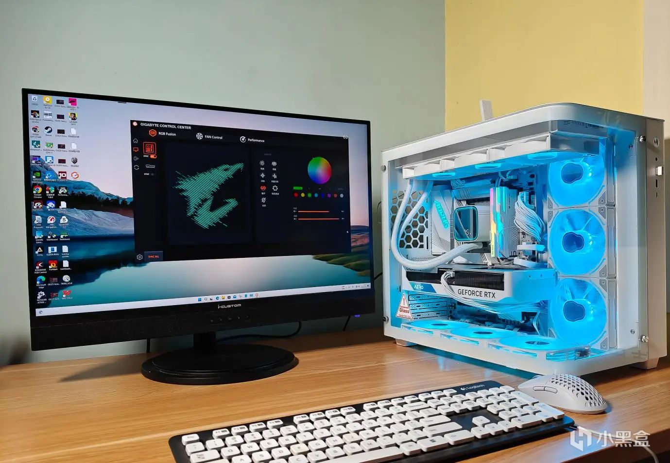 接上显示器,重启电脑,顺利进入系统。通过GCC软件,可以更改灯光的颜色,变成自己喜欢的效果。