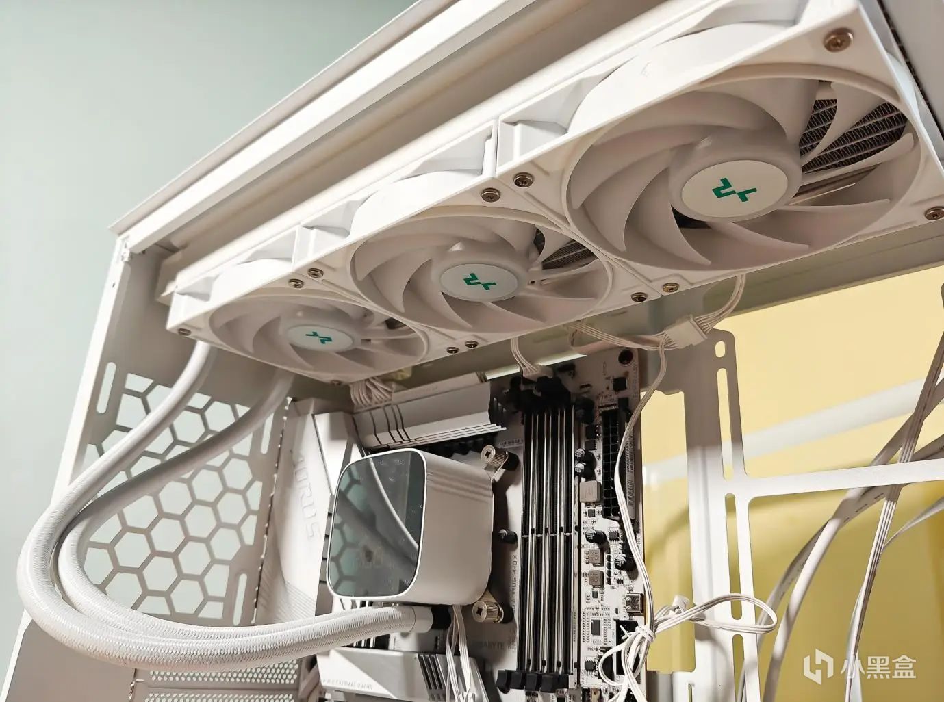 然后安装好水冷,是九州风扇的冰堡垒青春版,也是白色的,而且水冷头带有显示。