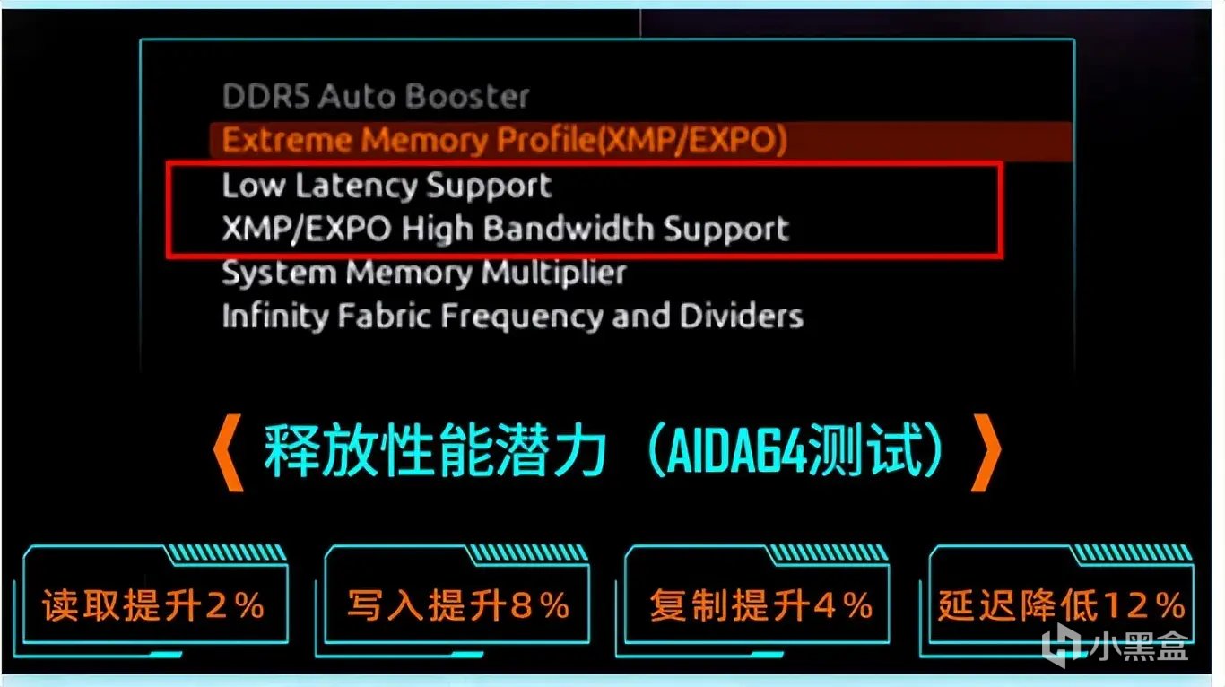 技嘉具有低延迟高带宽黑科技,可以在BIOS里一键开启,提升性能。同时支持手动超频,我们将内存手动超频到7600MHz,然后开启低延迟高带宽黑科技。