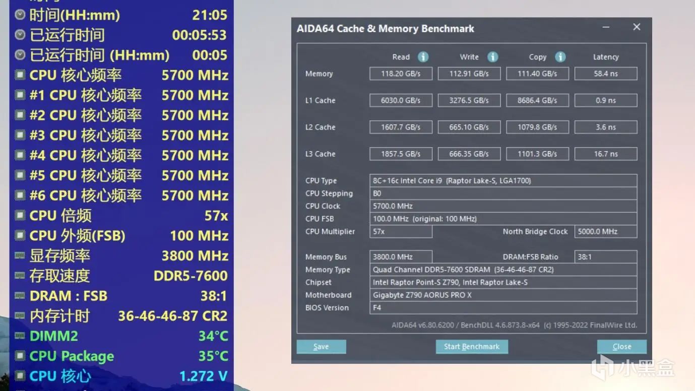 运行AIDA64内存测试,读取118GB/s,写入112GB/s,复制111GB/s,延迟大幅缩小到了58.4ns。