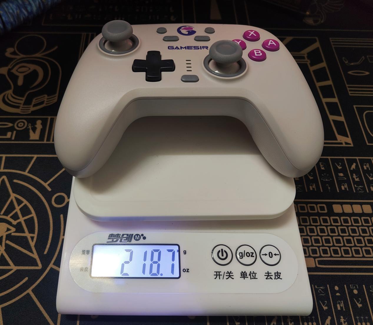 重量实测约为218g,作为对比,一个戴硅胶保护套的Switch Pro的重量约为290g,两者的重量差距主要体现在手柄厚度上,因此启明星NS版初次上手的感觉可能会比较轻盈一些,不过并不会让人感到哪里突兀,综合重量、模具、材质、涂层等因素来说,握持感还是非常不错的。