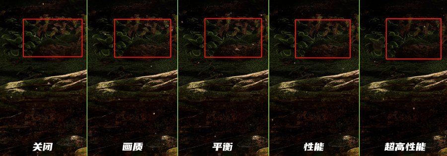 区别相对比较小,当DLSS越往超高性能迁移时,草丛叶片遮蔽阴影则会越深,但在细节上并没有什么明显的损失。