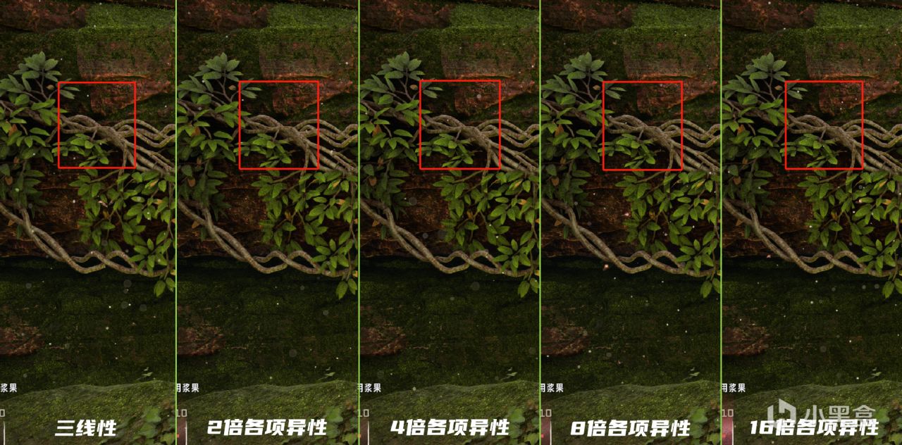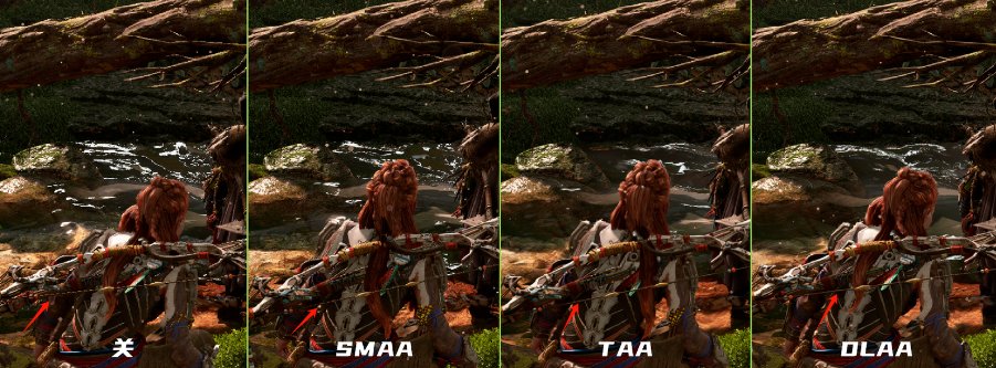 该选项至少开到TAA才能有比较舒适的观感效果。上图主要区别在于,人物弓箭的弓弦处和水流边缘。设置越高锯齿感越小,且噪点控制越好。