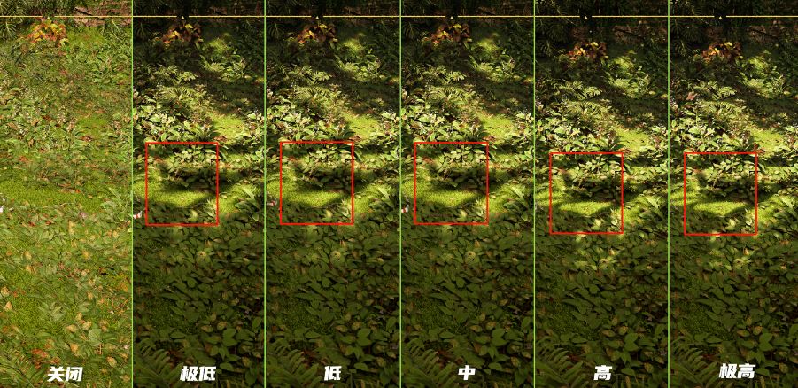 关闭到极低之间最为明显,这是阴影从无到有的根本区别。从中画质开始,阴影之间便不会有明显的连断,整体更加完整,往后越高阴影效果越清晰。