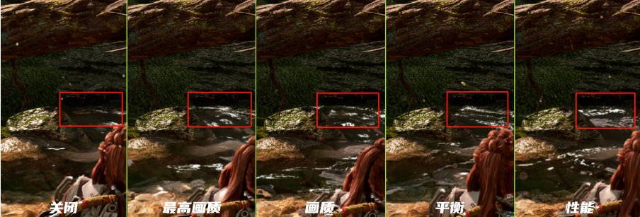 FSR可能是因为版本的问题,在《地平线:西之绝境》中的表现不尽人意。即便是画质选项,也能非常明显看出差异,其水面噪点及失真十分明显。