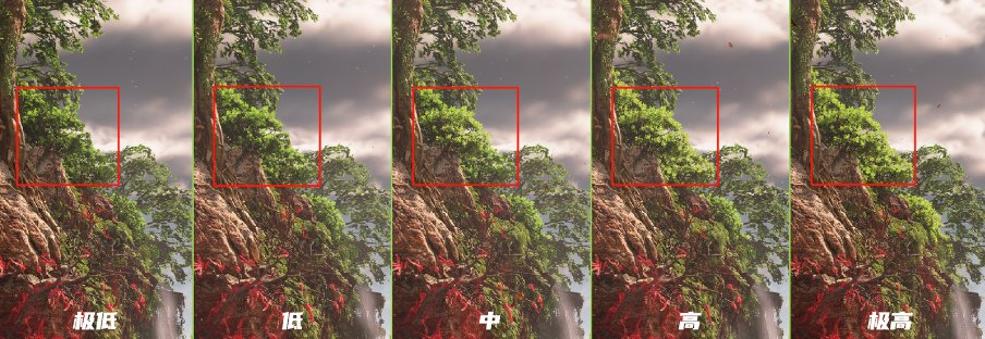从画面差异来看,中到高的区别最大。以树木根蔓为例,低和中设置下的纹理质量都比较欠缺。高与极高之间的纹理差距就比较小了。
