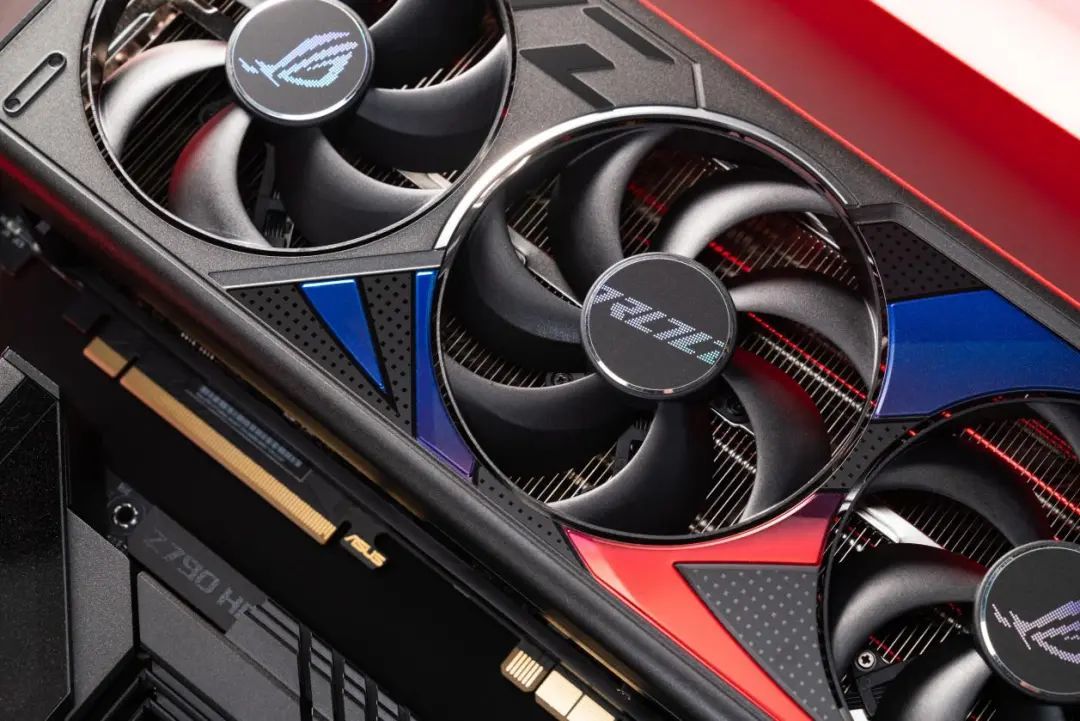 ROG STRIX RTX 4090D BTF还配备了3个升级的轴流风扇,采用双滚珠轴承,中间的风扇采用反向旋转的方式减少了扰流和噪声,增加了散热效率。