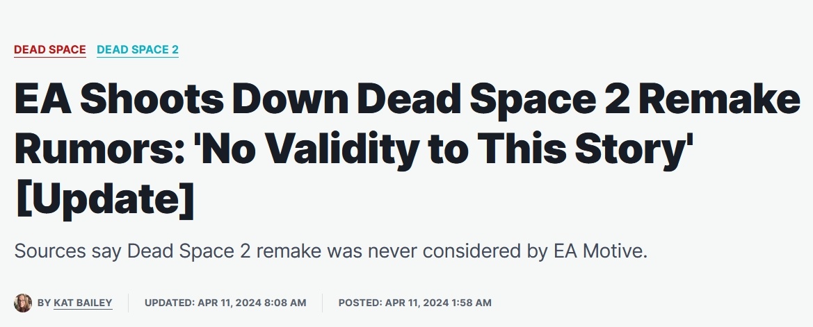 在出席最新一期的Game Mess Mornings节目时,Giant Bomb网站记者Jeff Grubb向主持Lex Luddy揭露,表示虽然EA Motive原本已经着手展开了《死亡空间2》重制版本的开发,但目前看来,这项计划似乎已经遭到了搁置或是取消,而背后的原因就是《死亡空间重制版》的销售表现欠佳。