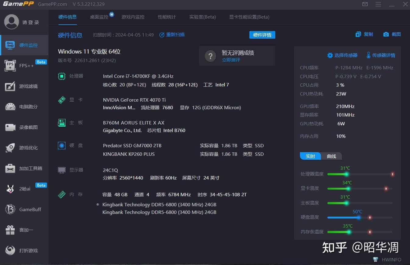 ▼处理器没啥说的,直接 Intel 就行,既能游戏也能生产力,14700KF/F 是14 代酷睿性能提升最大,同时也是最值得入手的型号, 8P + 12E、20 核 28 线程,此外 L3 缓存也从 30MB 增加到 33MB,性能媲美上代 i9 。预算紧张的话可以看看上代的 13600K ,放在这套配置同样不存在短板。
