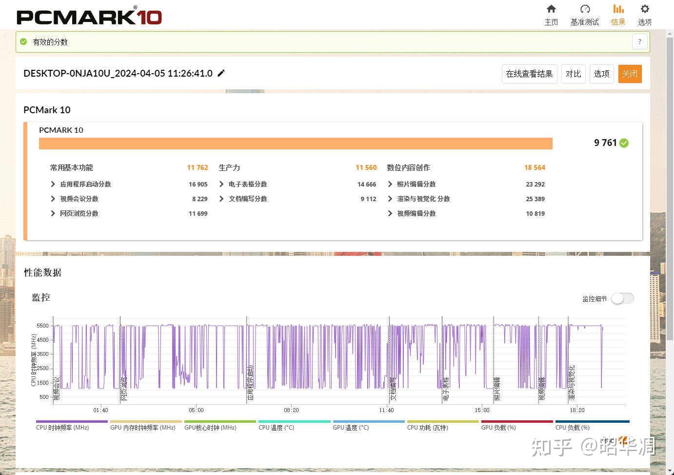 ▼ PC-MARK 是一款专业的计算机处理器性能评估软件,它具备全面的基准测试软件能力,主要用于评估整机综合性能,虽然该软件主要用于生产力测试,但也符合普通用户的需求。测试结果总分 9761,常用基本功能 11762、生产力跑分 11560、数位内容创作 18564。
