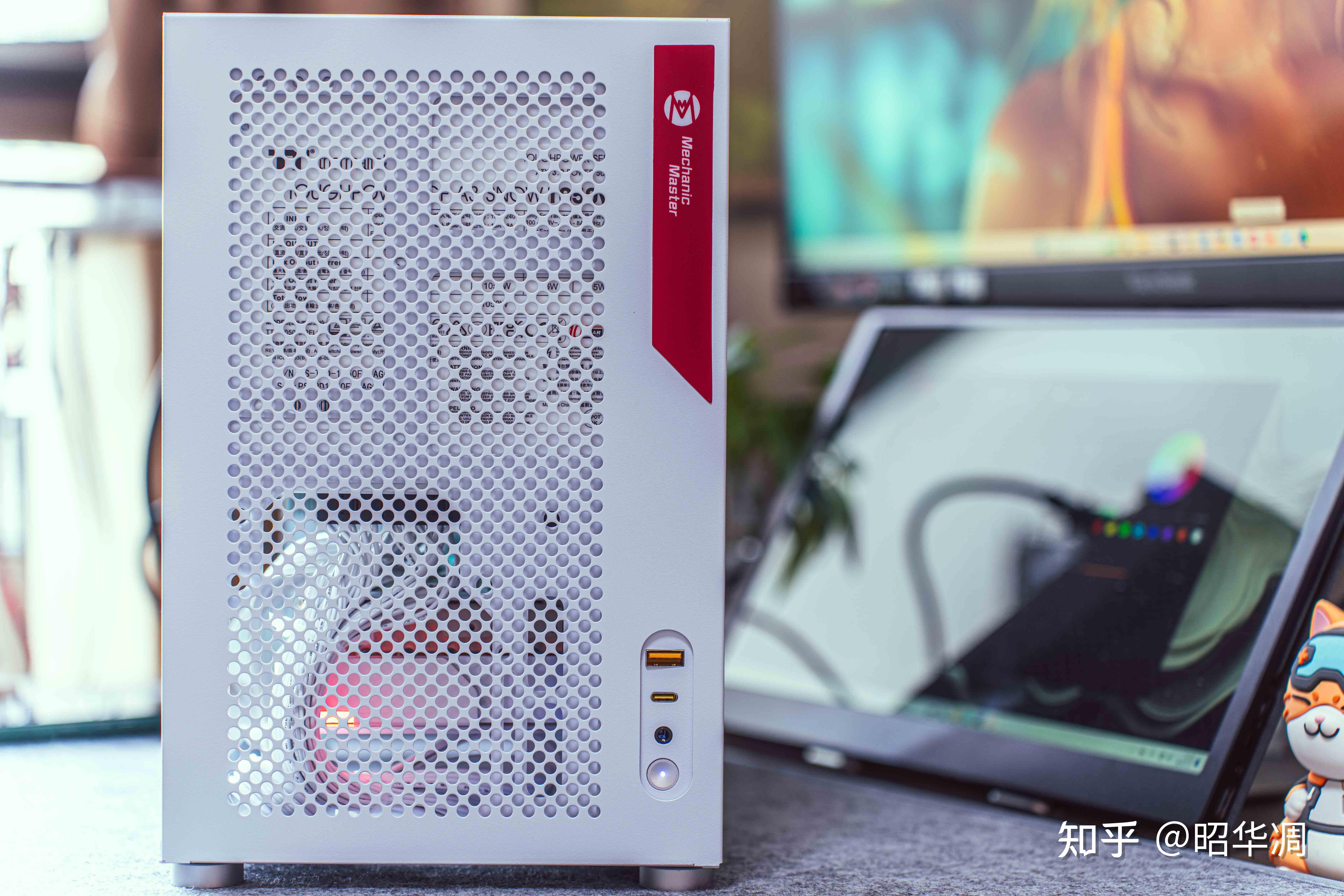 ▼正面比较简洁,I/O 接口位于右下区域,从上至下分别为 USB3.0、Type - C 插口、3.5mm 音频复合接口、金属电源开关。可以把配送的机械大师 LOGO 条贴上去,红色点缀更显灵动。