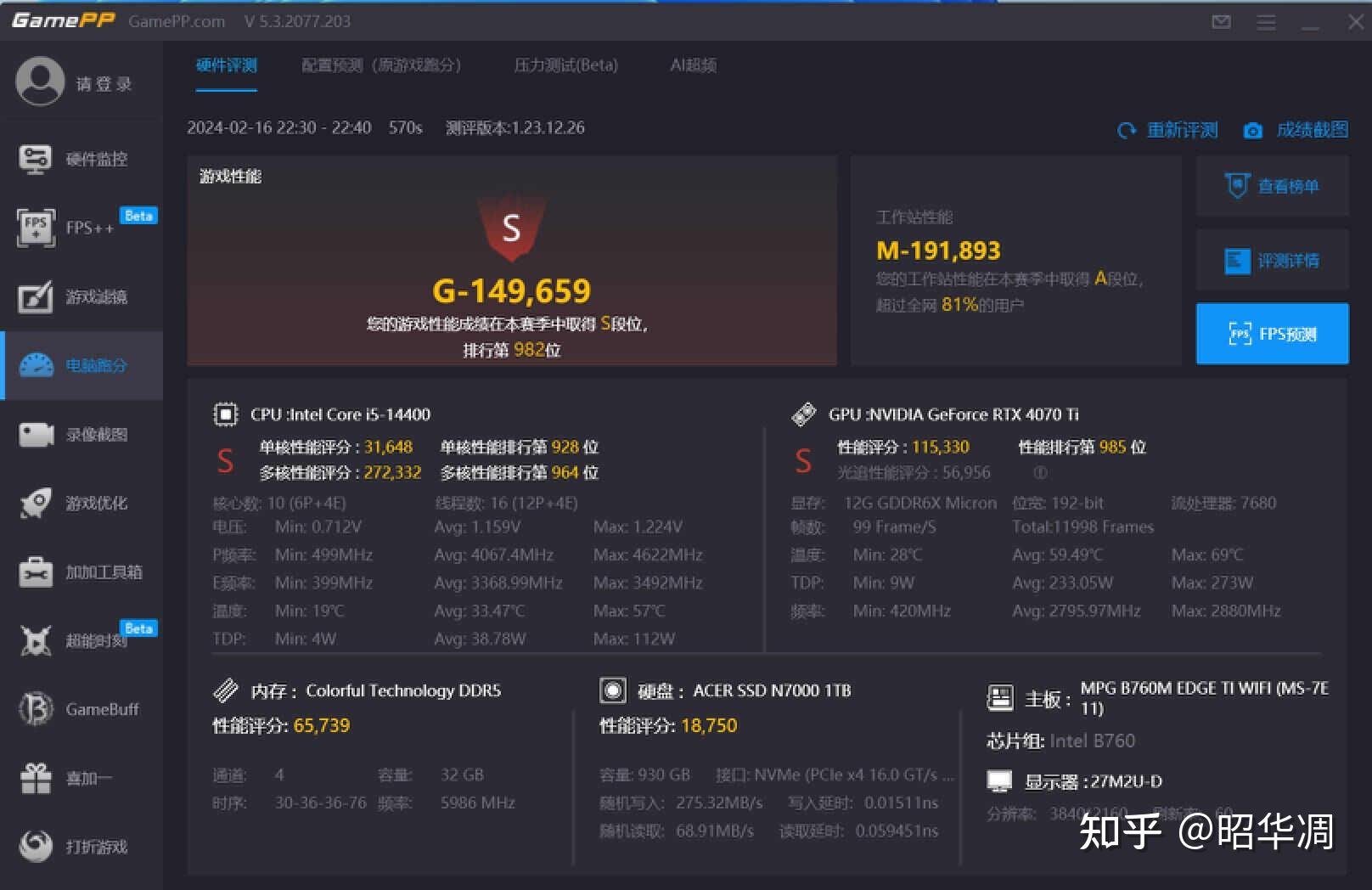 ▼游戏加加整体性能测试拿到了 149659 分,取得了“S”级性能评价。其中 CPU 单核得分 31648;多核得分 272332、显卡得分 115330、内存得分 65739、硬盘得分 18750。