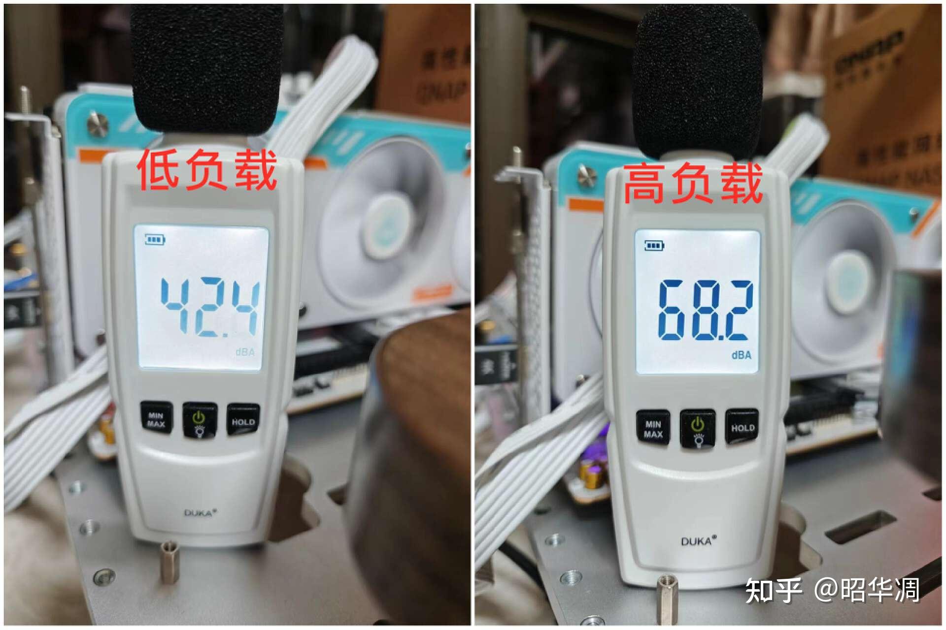 显卡在低负荷下没啥问题,几乎听不到噪音。但是只要高负荷下,比如游玩 3A 大作,还不用玩,只需要进入游戏显示 LOGO 的时候,显卡风扇会直接起飞,巨响那种。下面两张图分别是低负载和高负载的噪音对比,这个数据看着都吓人。