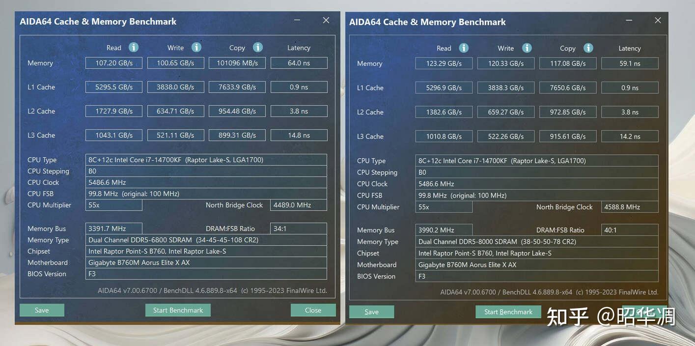 这块 14700KF 被我经常哪来做内存超频测试,甜点电压已经摸得差不多了,两三下就将其拉至到 8000MHz ,此时内存读取速度123.29GB/s,写入速度 120.33GB/s,复制速度 1177.08GB/s,延迟 59.1ns。