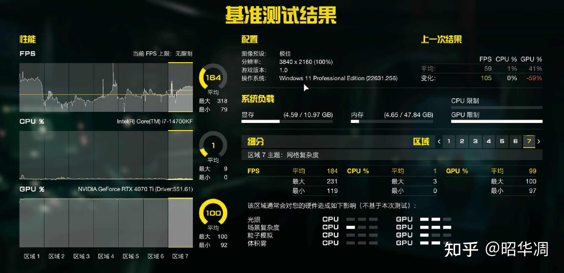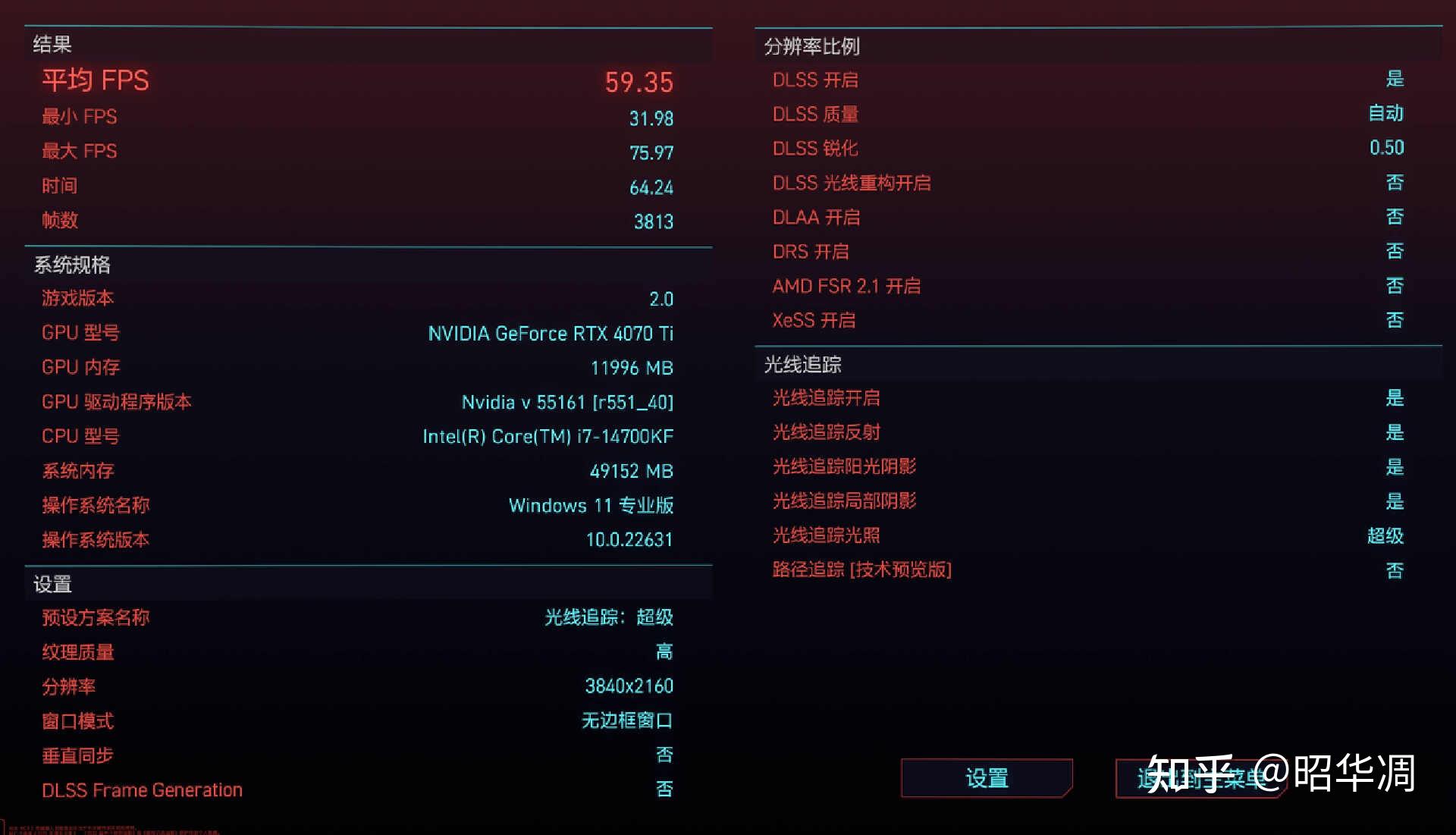 ▼赛博朋克 2.0 性能测试, 4K 分辨率 / 超级光追 / DLSS 自动,平均帧率 59FPS。