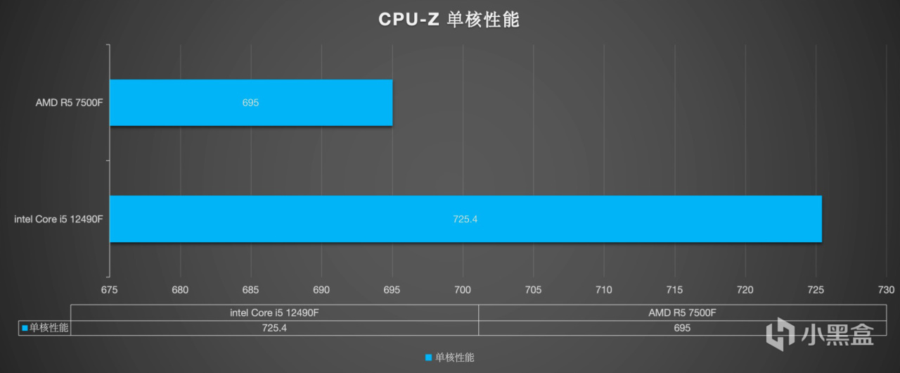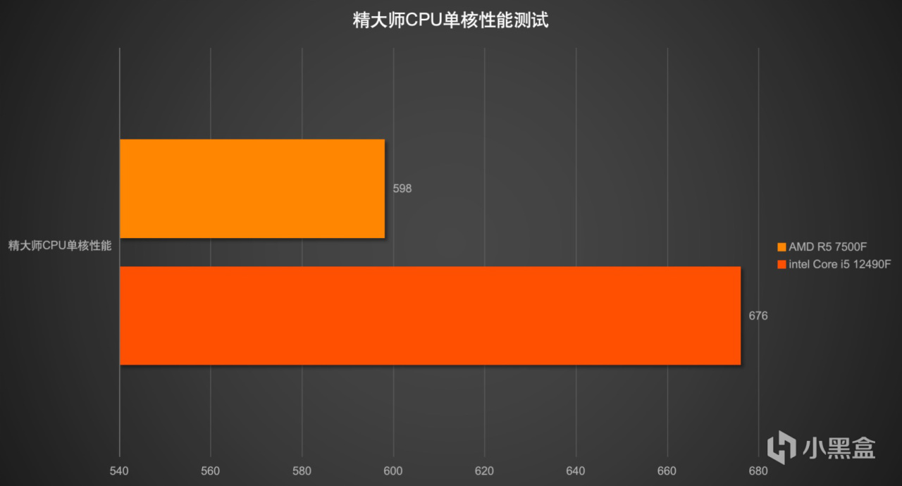 我这里测试了一下精大师CPU单核心测试,可以看到intel Core i5 12490F在单核性能方面明显是要更强的,就算是到了这一代的AMD Ryzen 5 7500F也依旧不是对手。