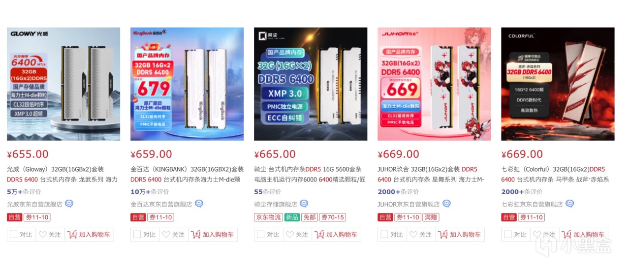 要知道目前新装机内存都是16GB×2的32GB套条起步,那么DDR5内存在AMD平台上的同步频率最佳就是6400 MHz,再高就是分频而且价格也很贵完全没必要了。DDR5最便宜的内存选择用光威和金百达,差不多也是要655元左右。
