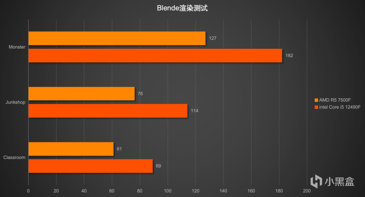 那就以跑blender渲染进行测试吧,在以上三个大的测试场景中intel Core i5 12490F也是明显要领先AMD Ryzen 5 7500F许多,果然渲染软件都是有对intel平台做优化,领先幅度是相当明显的。