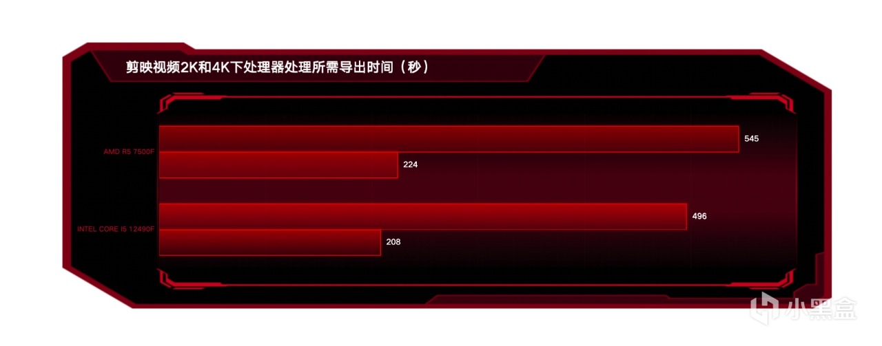 测试了一下用剪映软件对已经剪辑好的视频做导出,可以看到用intel Core i5 12490F处理器所耗费的时间,无论是2K分辨率的视频还是4K分辨率的视频都是intel更快,推荐剪辑行业用户可以首选intel平台在效率上会更有保障。