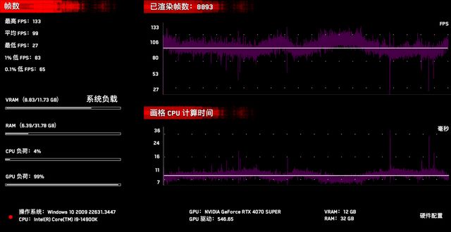 ▲在4K分辨率,DLSS性能模式,全部设置最高的情况下,iGame GeForce RTX 4070 SUPER 雾山五行定制版 OC 12GB,且GPU符合高达99%属实是跑满了。