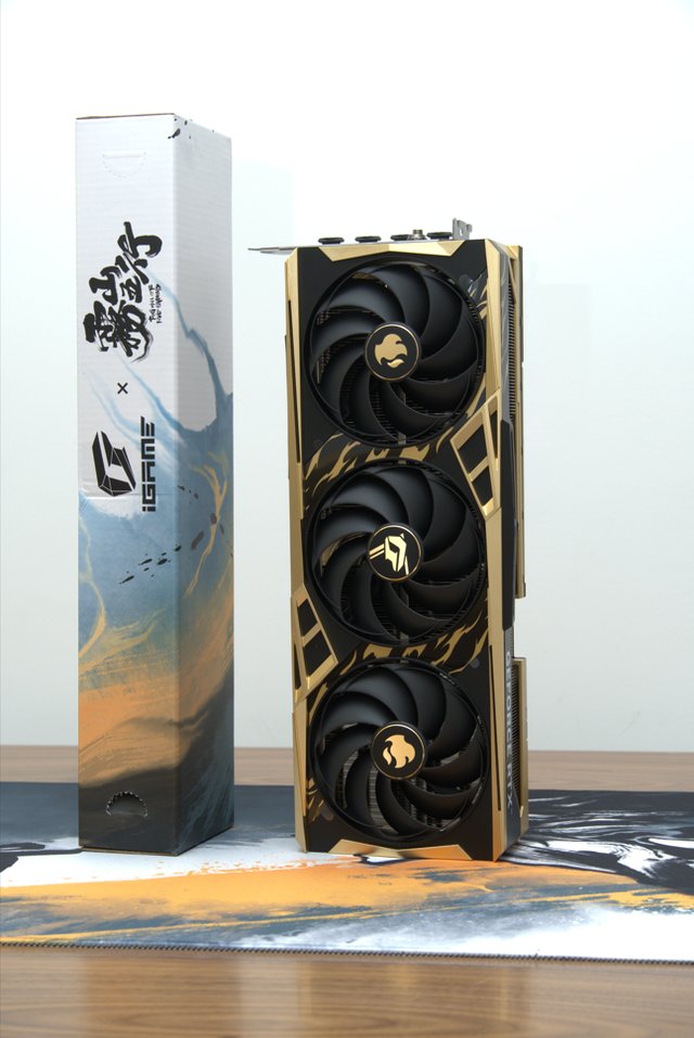 七彩虹火神显卡的做工和用料相信不必我多说,9翼扇叶如镰刀般锋利厚实,散热性能只能用出彩来形容,正面金色的金属外装甲上拥有火焰纹理,左右两个风扇中间也同样改为了火焰图案,既代表雾山火行闻人翊悬,也代表了七彩虹iGame火神系列,可以说是一箭双雕了。