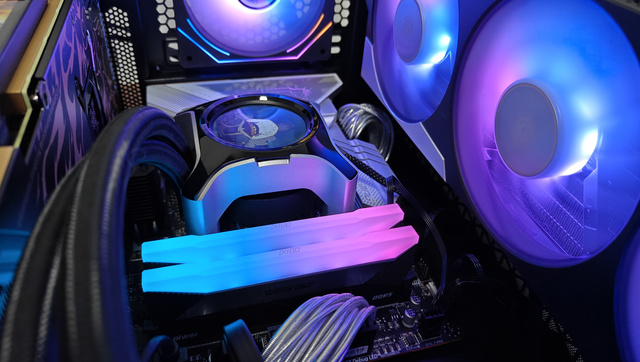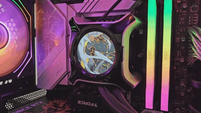 ▲内存采用的是佰维旗下最近推出的悟空 DX100月光宝盒内存,选择这款内存的最大原因便是其拥有超大的RGB发光面积,是市面上常见RGB内存的三倍,提供的魔幻效果十分适合放在这款双屏幕的炫酷机箱中。