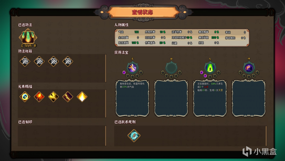 当然作为一款味道十分对味的肉鸽游戏,其中build构筑部分内容自然是不能少的。这款游戏中玩家可以选择各式各样的功法,通过不断闯关进行升级,琳琅满目的法宝和大量的道具,极大程度的丰富了玩家的选择空间,玩家可以凭借着自己的喜欢搭建出独属于自己的战斗体系。游戏简单来说更像是《暖雪》和《哈迪斯》的结合体,既有前者的各种等级和增益的功法和需要镶嵌命珠升级的法宝,也有后者的元素选择和一些基础数值的提升。