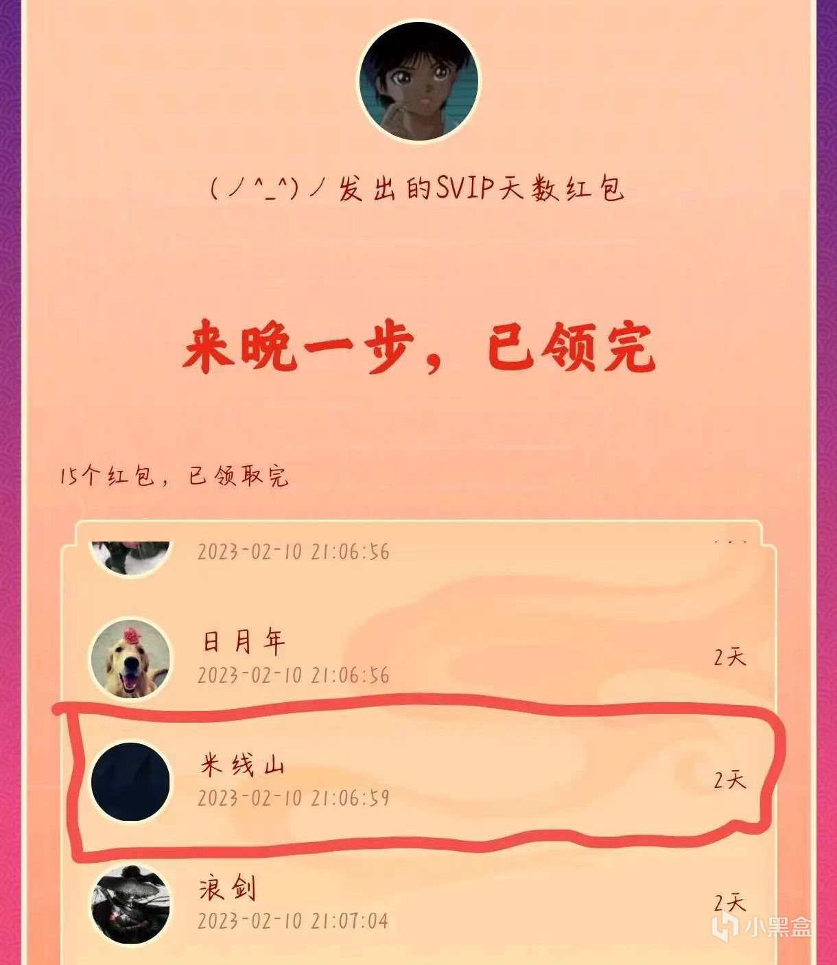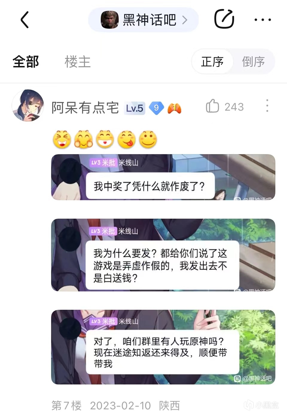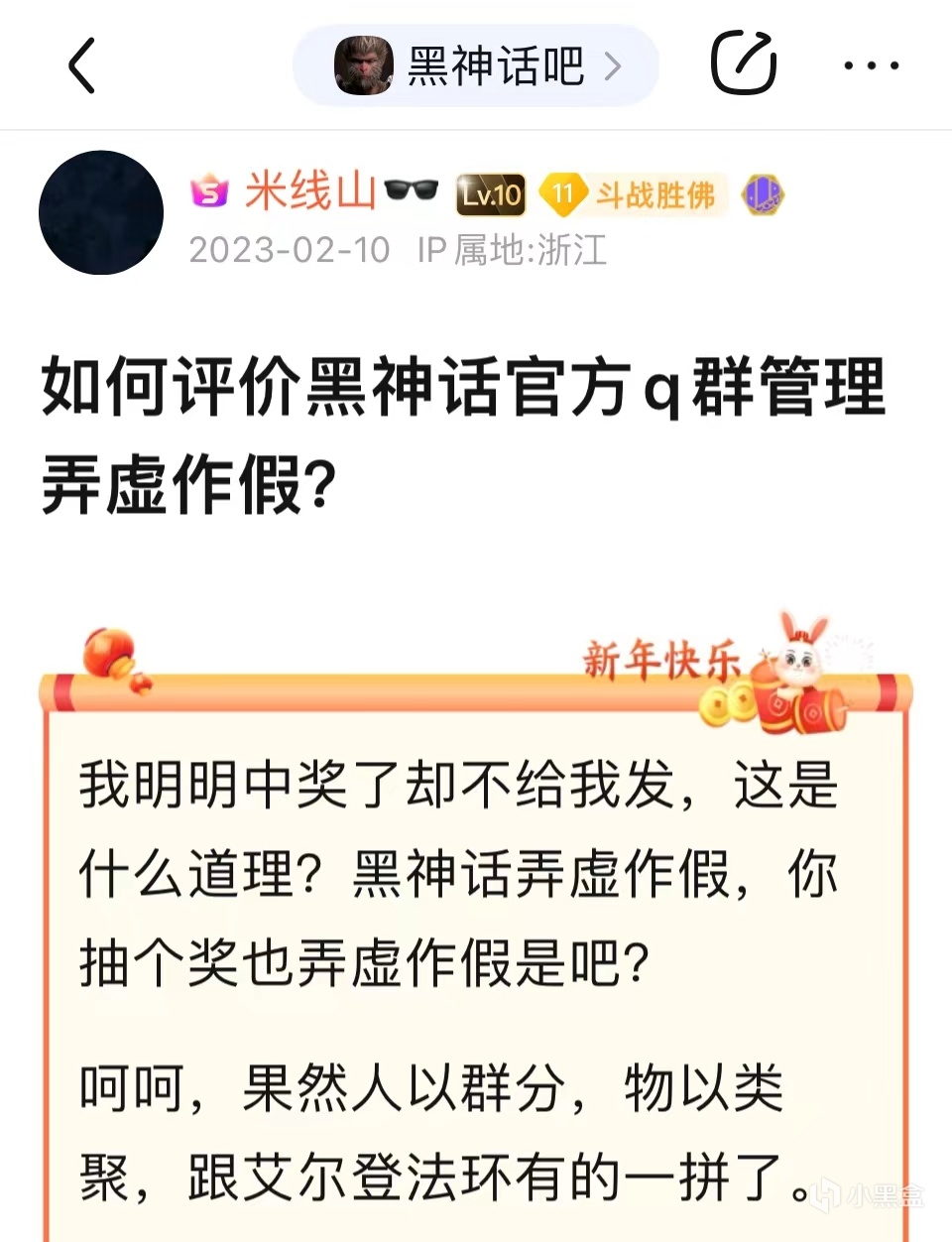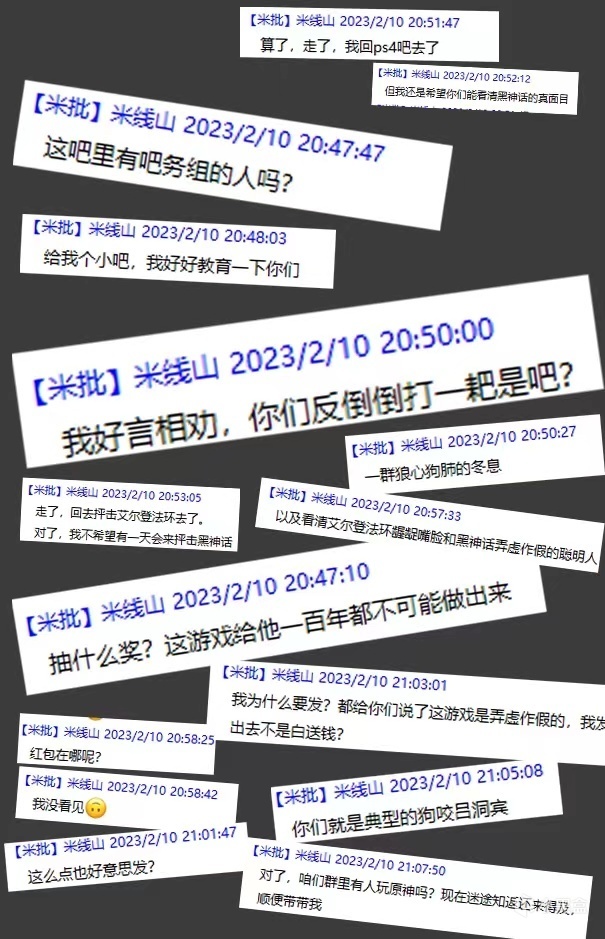 2023年2月10日,米線山又於“黑神話吧”發貼,聲稱自己在q羣中抽中了獎卻沒有領到紅包,並批評“黑神話吧”和《黑神話》這款遊戲一樣都擅長弄虛作假,一時間,他成了吧內網友們快樂的源泉,有關米線山在黑神話q羣中各種發言的p圖廣泛流傳了出來。一段時間後,米線山又發帖聲稱黑神話吧內有一大半的熱度都是自己給引來的,並向吧主索要小吧之位,整個黑神話吧隨即洋溢在了一片歡樂的氛圍中。