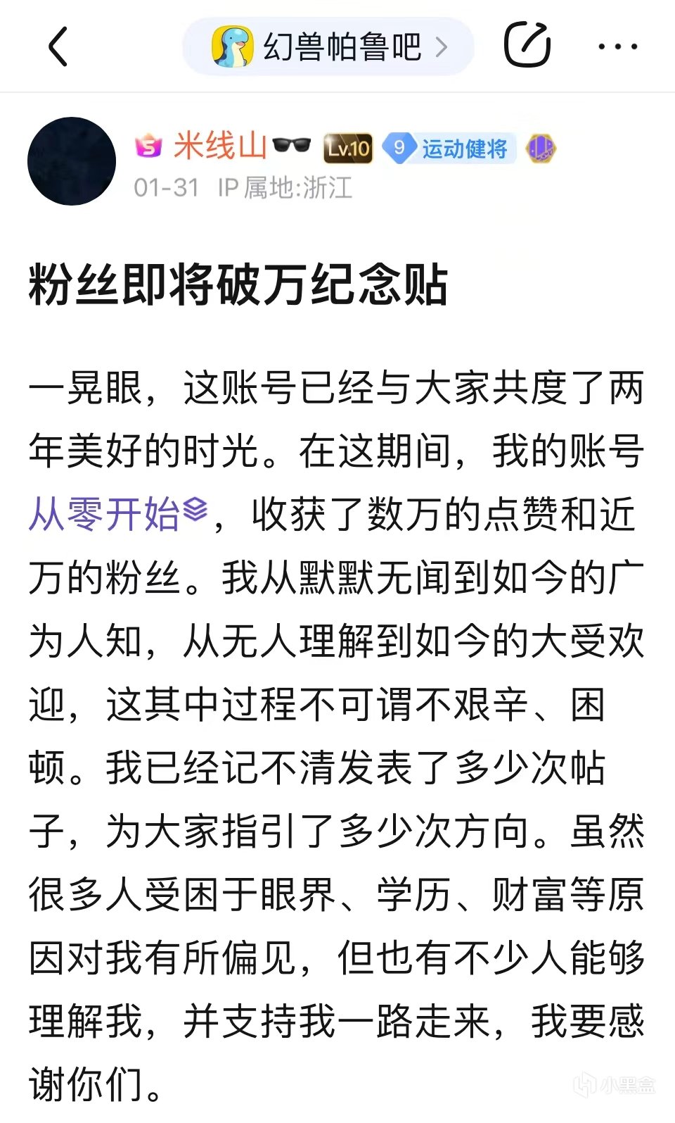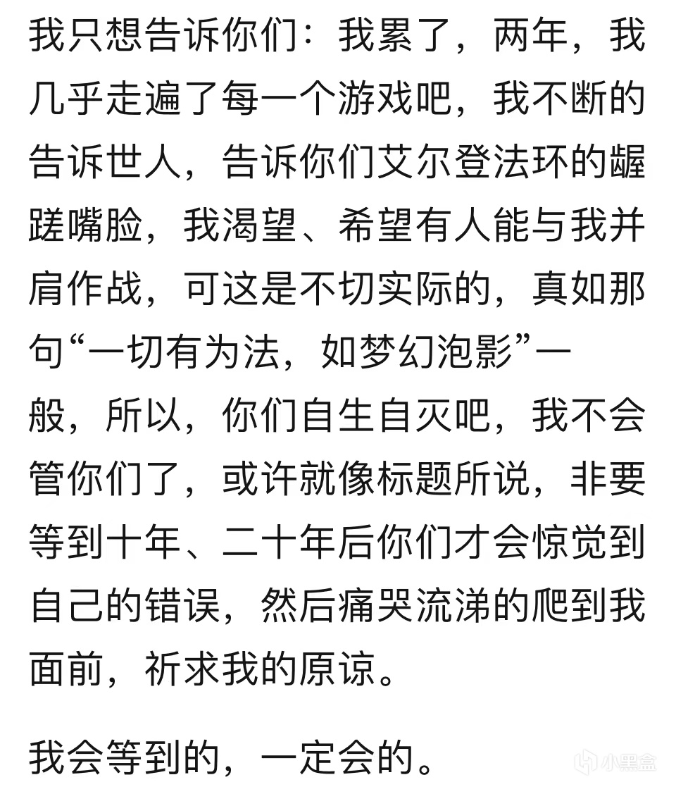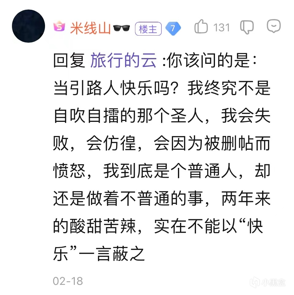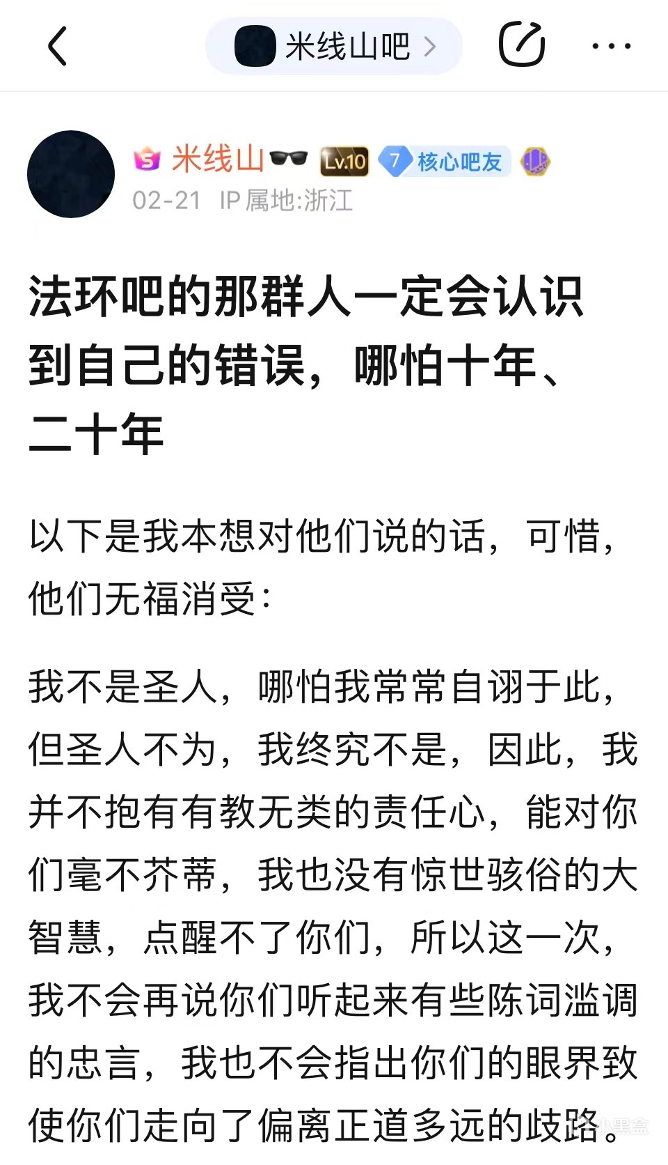 歸來後的米線山,難得地向吧友們吐露過幾次自己的心聲,即便他還遠遠做不到敞開心扉,但我們仍然可以從這些看似空洞的話語中,捕捉到一絲這個人內心的真實想法。2024年1月31日,在粉絲即將破萬之際,米線山專門發表了一篇紀念貼,在這篇帖子中,米線山回顧了自己一路走來的心路歷程,並向那些支持他的吧友們表示了感謝。一段時間過後,米線山還發帖喊話“艾爾登法環吧”,他聲稱自己已經累了,這兩年間,他幾乎走遍了每一個遊戲吧,不斷地告訴世人艾爾登法環的齷齪嘴臉,但現在他已經不想再管那些法環玩家了。