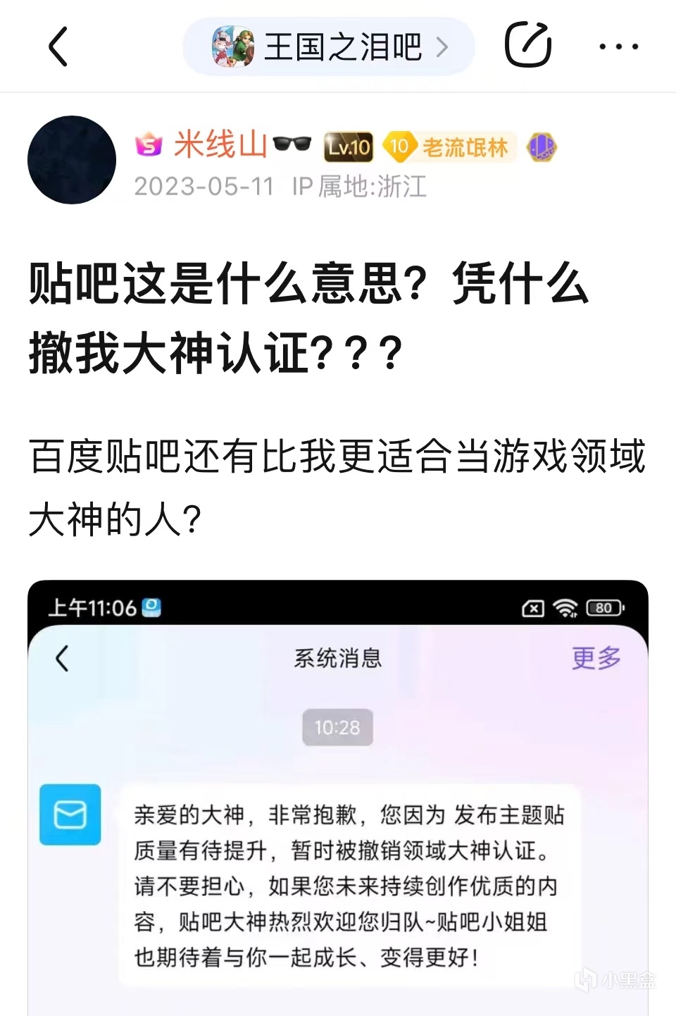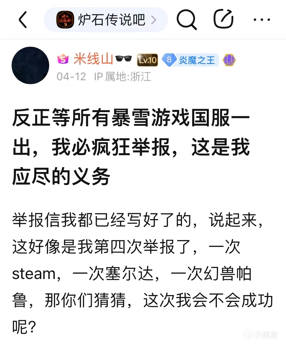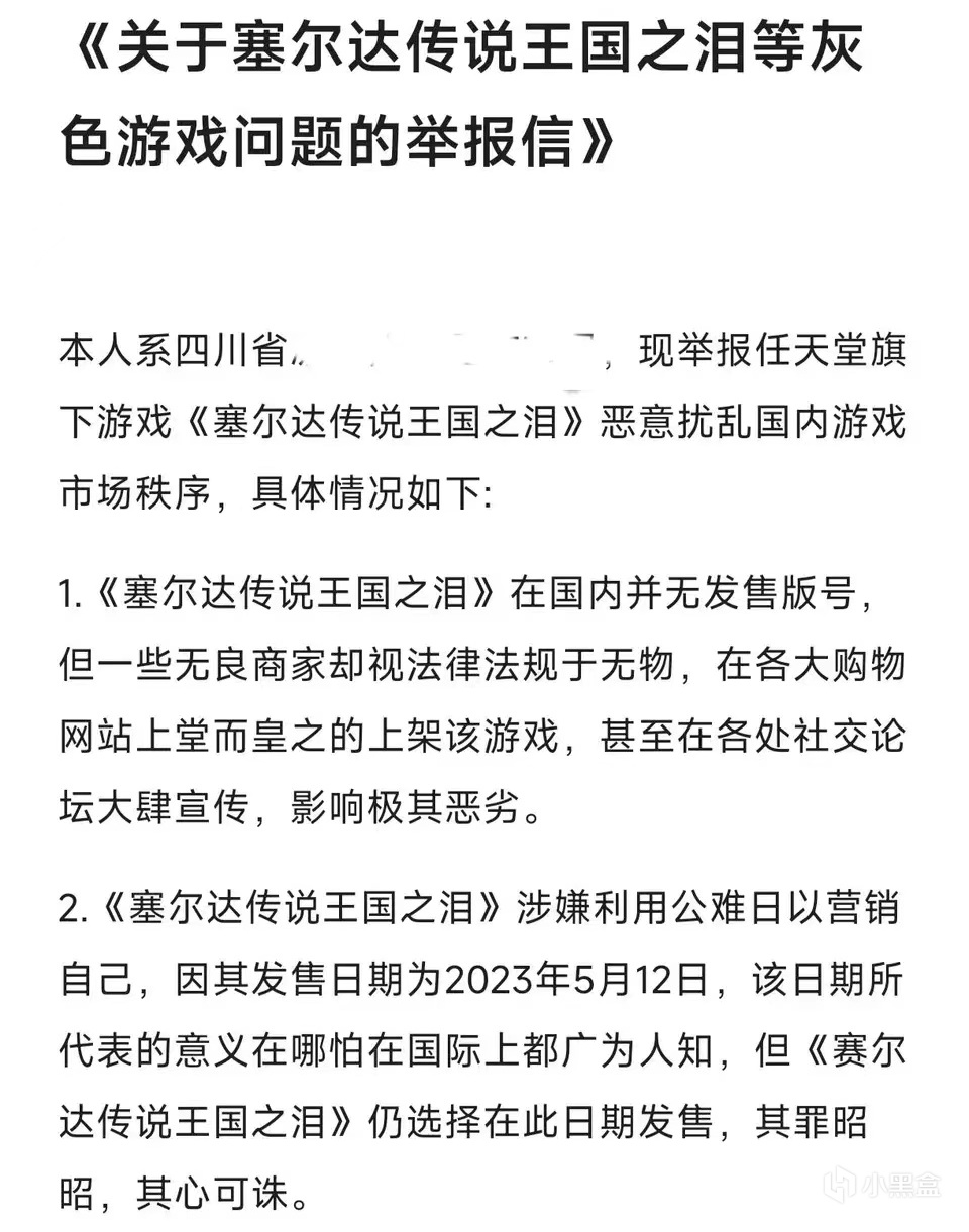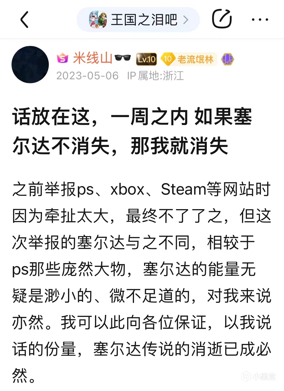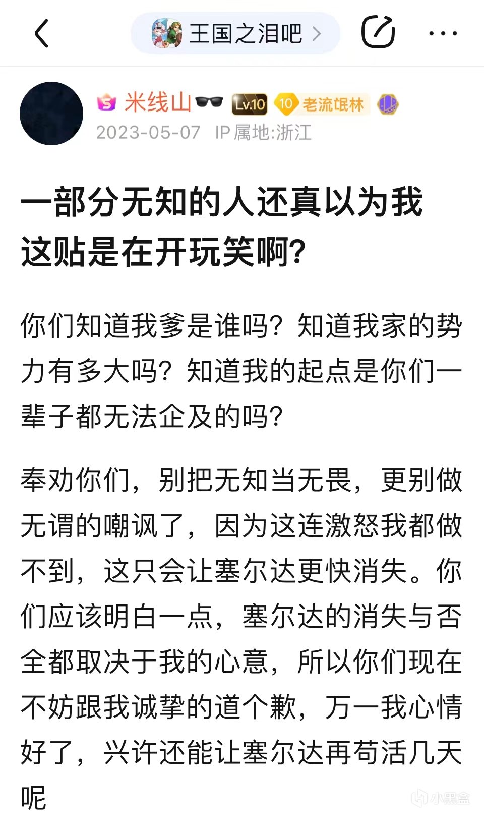 5月6日,一篇驚人的貼子橫空出世——“話放在這裏,一週之內,如果塞爾達不消失,那我就消失”,發帖人聲稱要舉報《王國之淚》,並且還附上了一張自己正在寫的舉報信的截圖,再看那發帖人的姓名——果不其然,正是叱吒王國之淚吧的風雲人物——米線山,這篇帖子將王淚吧的戰爭升級到了一個新的高度。第二天早晨,米線山緊接着又發了一篇帖子,他聲稱自己的家世背景極爲強大,可以輕而易舉地讓《王國之淚》消失,一時間,這兩篇貼子爲吧友們所津津樂道,大家都想知道《王國之淚》是不是真的要胎死腹中了。