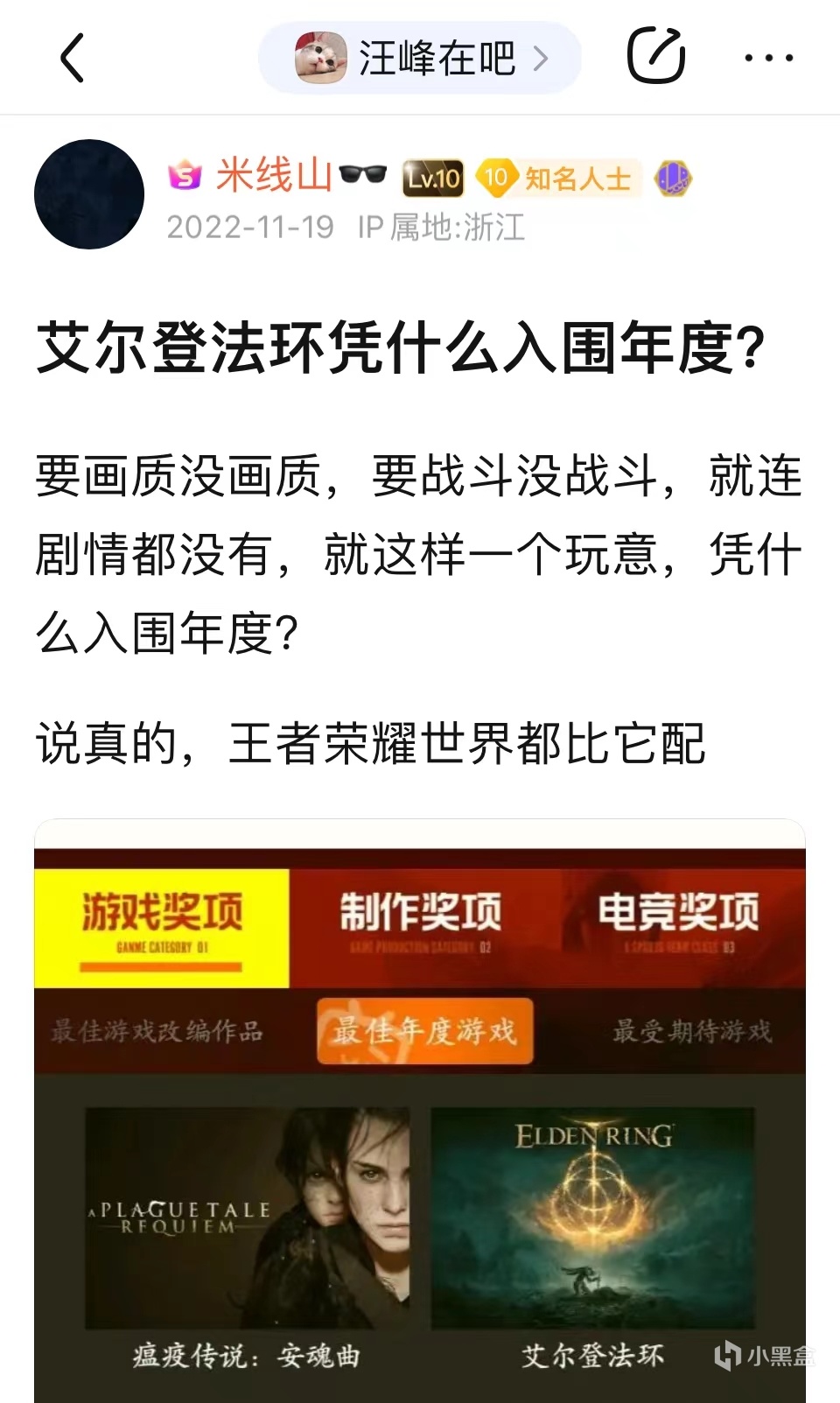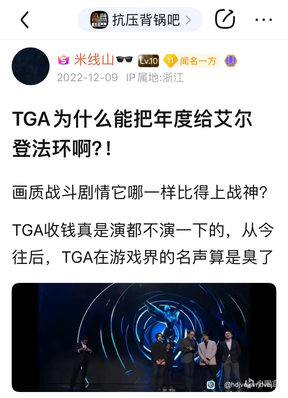 隨着名字的變化,米線山的發帖生涯也迎來了新的發展。那段時間正值《戰神5》發售和TGA年度遊戲評獎兩個事件連在了一起,米線山隨即在ps4吧和戰神吧等地發表大量抨擊《艾爾登法環》的貼子,他最常說的一句話便是自己用作貼吧和b站簽名的那句“《艾爾登法環》偷的年度什麼時候還回來?”《艾爾登法環》一直以來都是讓米線山最爲執着的事物,他在整個發帖生涯中從未停止過批評這款遊戲,而且不論他想抨擊哪款遊戲,甚至抨擊那些不是遊戲的東西,他都會帶上一嘴《艾爾登法環》,可謂是不忘初心。