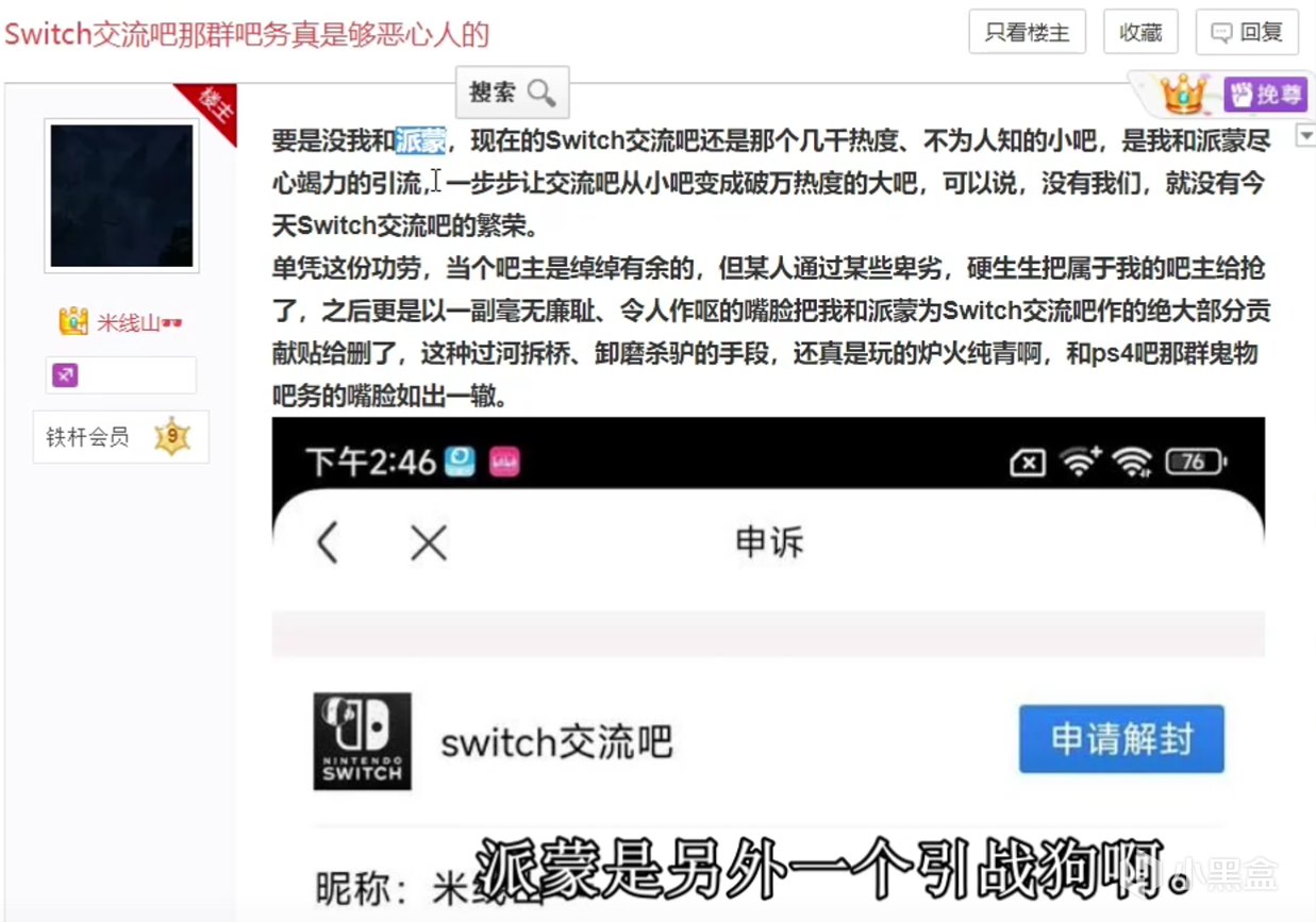 隨着自己的名望與日俱增,米線山漸漸也有了苦惱:他發現自己精心創作的貼子,總是存活不要多久就會被吧務們刪除,即便是被米線山視爲自由之地的ps4吧,前段時間也永久封禁了他。有沒有這樣一片淨土,想說什麼就可以說什麼,發表任何言論都不會被吧務們刪除呢?還真有一個——switch交流吧。