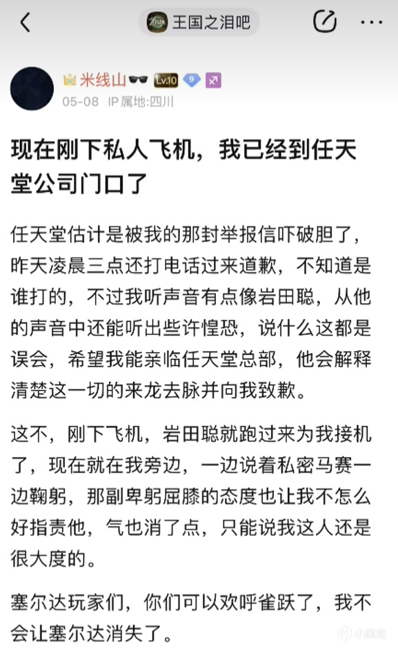 然而僅僅到了第三天,也就是5月8日,最爲戲劇性的一幕出現了——米線山再次發貼——“剛下私人飛機,我已經到任天堂公司門口了“,米線山聲稱任天堂的前社長巖田聰親自約見了自己,在他的不斷道歉以及誠摯懇求之下,自己大手一揮,決定原諒任天堂,《王國之淚》不用消失了。本來這一系列的反轉就已經讓吧友們覺得樂趣十足,但更有意思的是——巖田聰他可是已經去世了,那米線山究竟是怎樣見到他的呢?一時間,吧內充滿了快活的空氣,大傢伙都打趣說米線山懂得招魂之術。