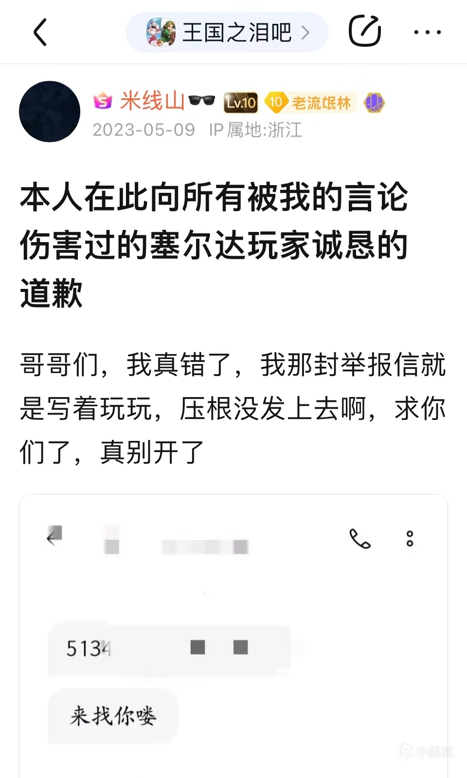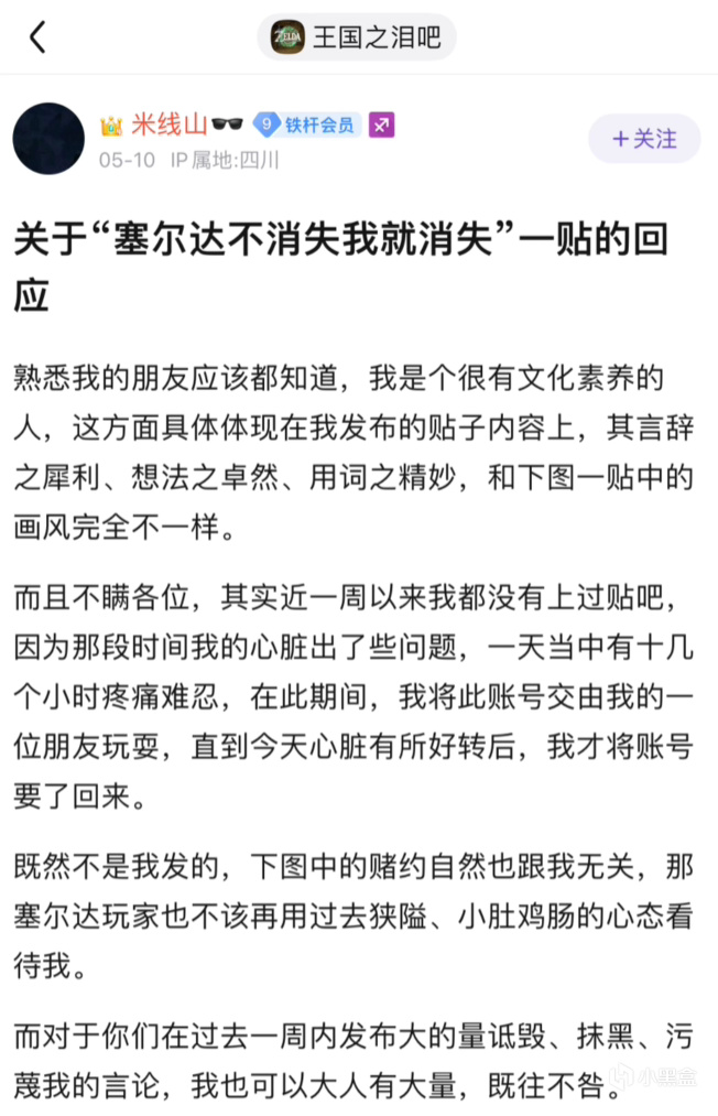 這件事還沒有結束,5月9日,米線山又發了一個新帖子——”本人在此向所有被我的言論傷害過的塞爾達玩家誠懇道歉“,米線山請求玩家們不要開自己的盒,還說當初的那封舉報信根本就沒發上去。昨天還意氣風發地赦免了塞爾達,今天便低聲下氣地請求吧友們原諒,態度轉變不可謂不大。5月10日早晨,米線山再發新帖,又換了一個說辭——他聲稱自己在這一週之內從未上過貼吧,這個賬號一直是交由他的一位朋友使用的。