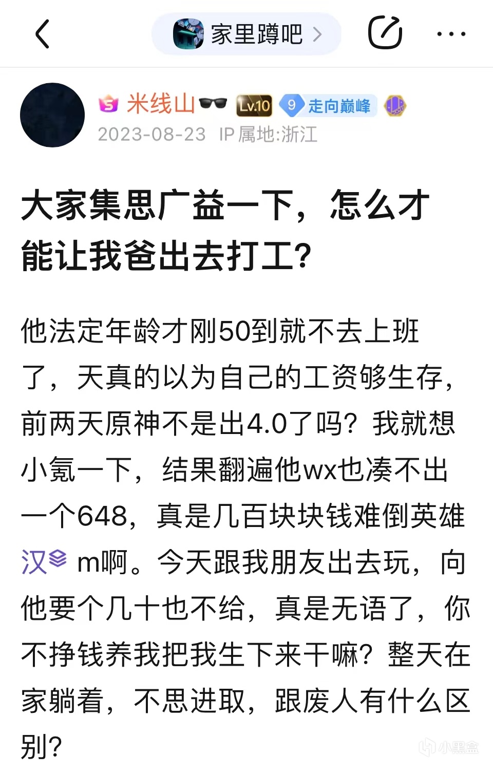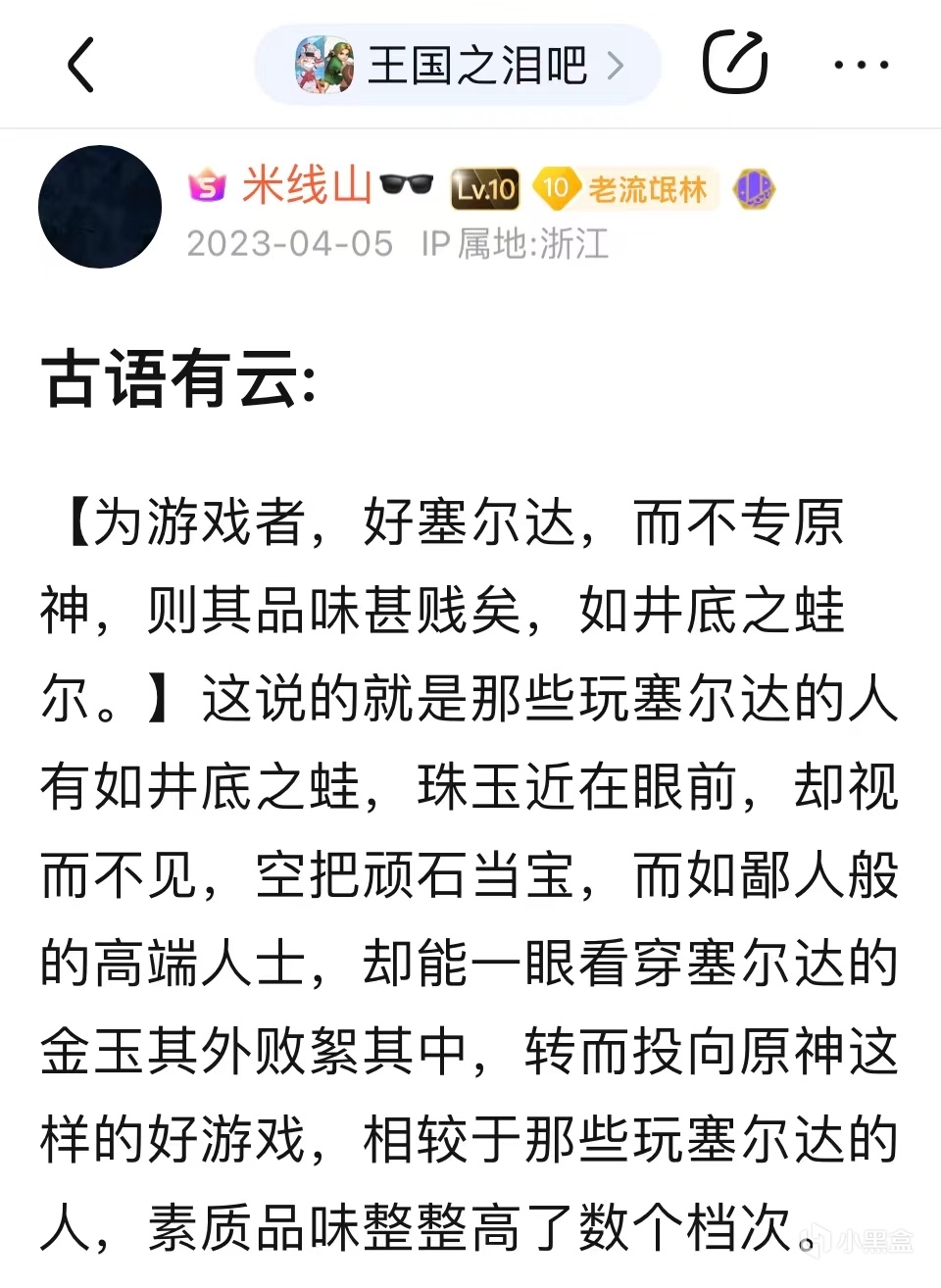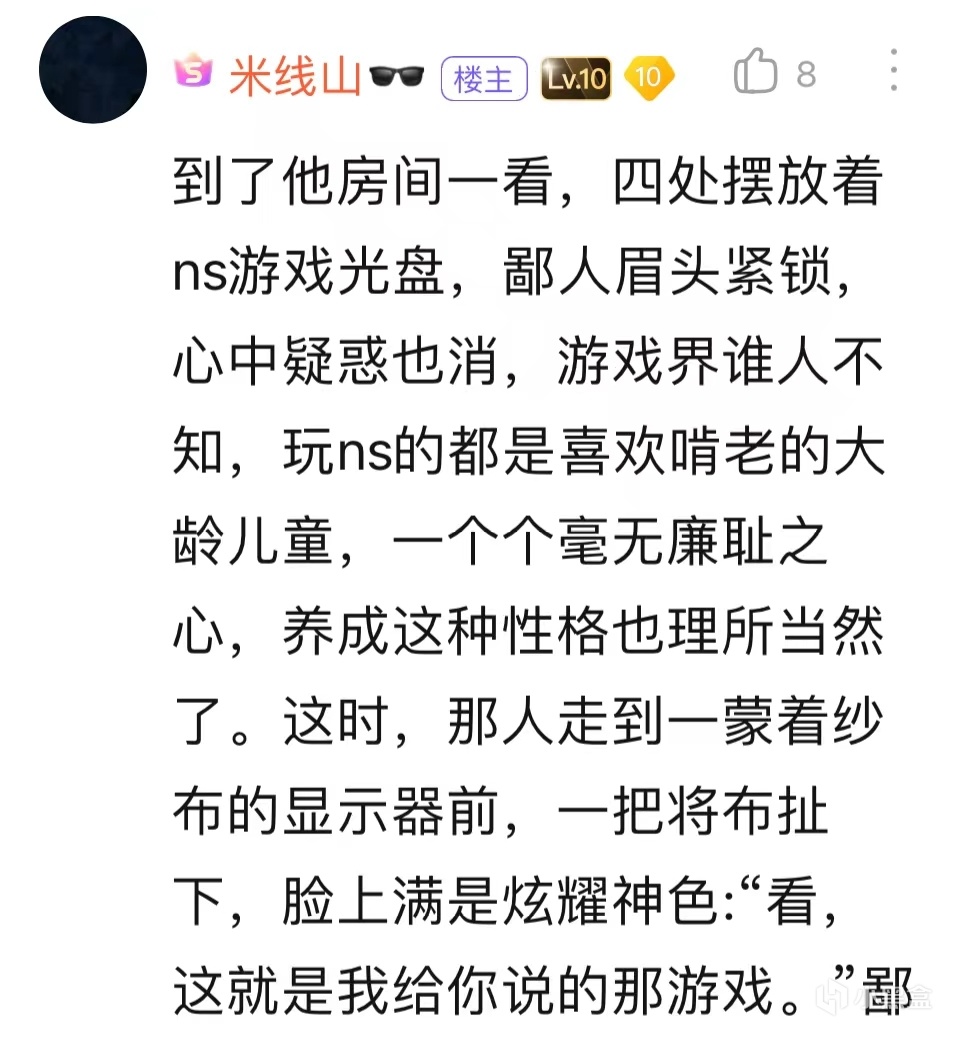 switch交流吧,這裏是專玩破解版遊戲的任天堂玩家聚集地,和其它吧相比,這裏有一個得天獨厚的條件——這個吧沒有吧主,發什麼樣的貼子都不會被刪。3月初,switch交流吧便聚集了幾位對任天堂頗有意見的人物,他們在這裏猛烈地抨擊switch和兩個月後即將發售的《塞爾達傳說:王國之淚》,並且時不時還發一些跟任天堂完全無關的其它遊戲的貼子,米線山憑藉敏銳的嗅覺,很快便也來到了這個吧,他剛來的時候,還在進行着自己批評《艾爾登法環》的事業,但是看了一圈,發現別人都在罵任天堂,隨後米線山受這些人影響,做出了自己發帖生涯中極爲重要的一個決定——他也對任天堂和《王國之淚》展開了抨擊。