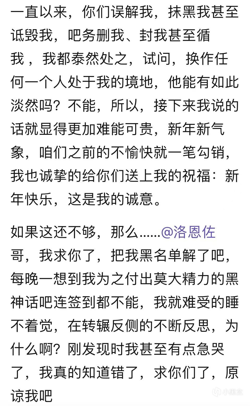 2024年1月12日,米線山屈服了,他再次前往黑神話吧發帖,懇請黑神話吧吧主將自己從黑名單中給放出來,按他自己的話來講“每晚一想到在我爲之付出莫大精力的黑神話吧連簽到都不能,我就難受得睡不着覺,輾轉反側地不斷反思,爲什麼啊?剛發現時我甚至有點要急哭了”這段請求可謂是寫得聲淚俱下,然而黑神話吧卻並沒有滿足米線山的願望,他還是被永遠地囚禁在了黑名單中。