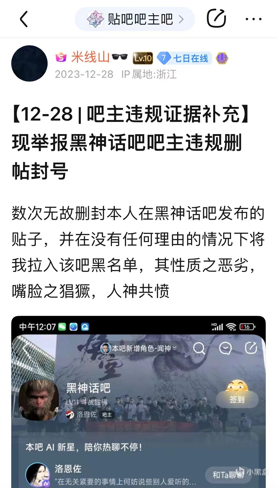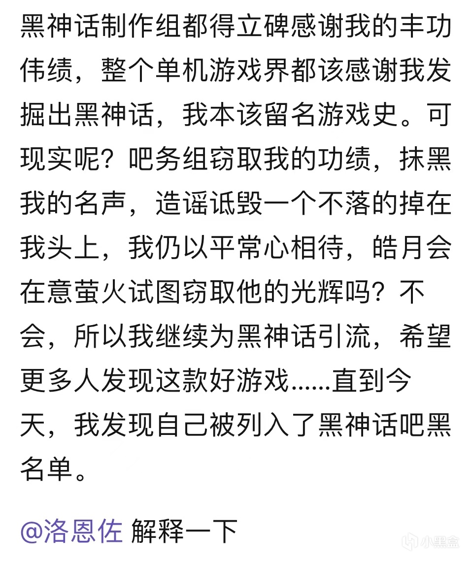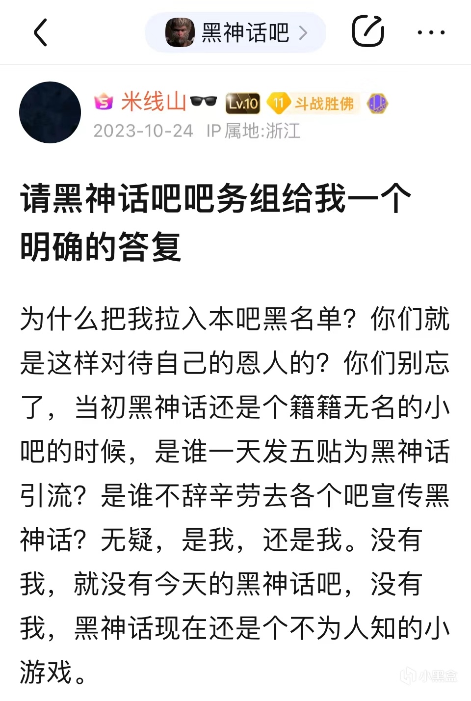 2023年10月24日,米線山在“黑神話吧”發帖, 他聲稱自己每日孜孜不倦地宣傳黑神話,而吧務們卻恩將仇報,將他列入了黑名單。12月28日,眼看自己一點也沒有被從黑名單中釋放出來的跡象,憤憤不平的米線山前往“貼吧吧主吧”舉報了黑神話吧吧主,然而這一系列的行爲並沒有爲米線山帶來他想要的結果,黑神話吧吧主並沒有受到懲罰,米線山也沒有被解禁。