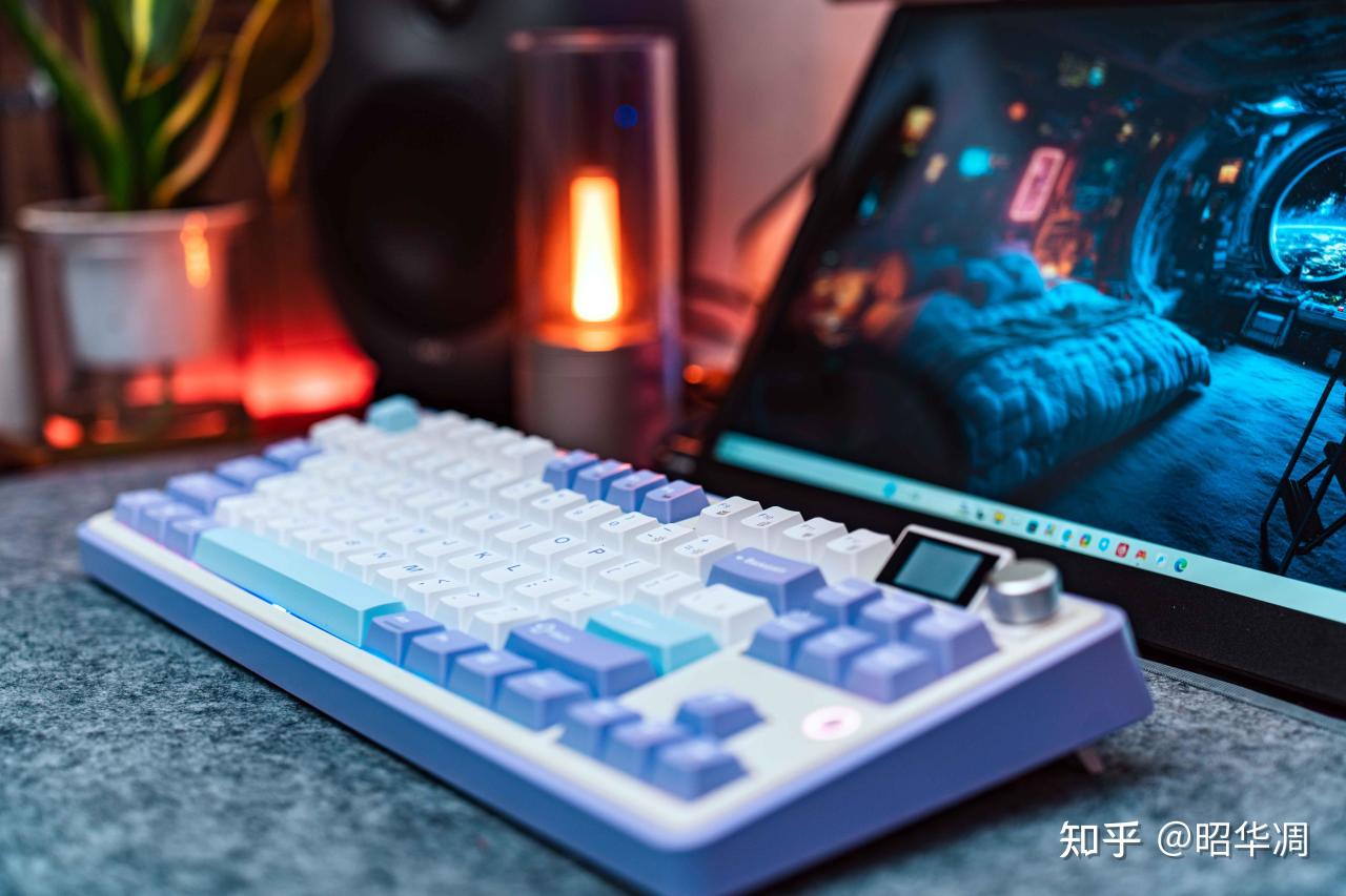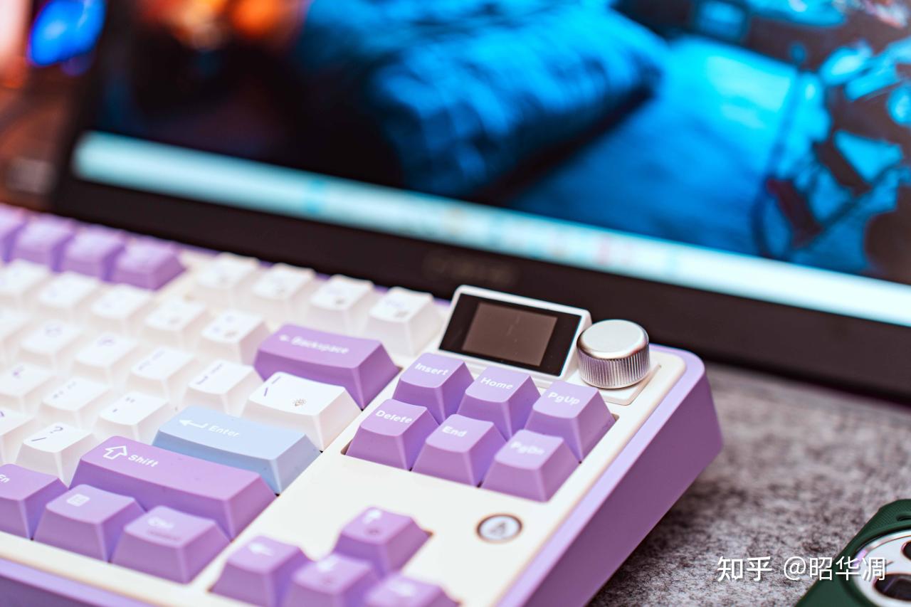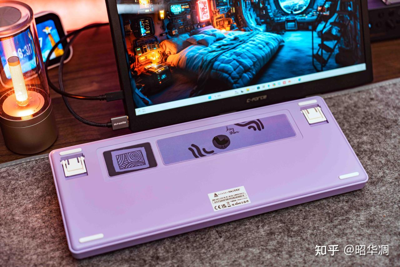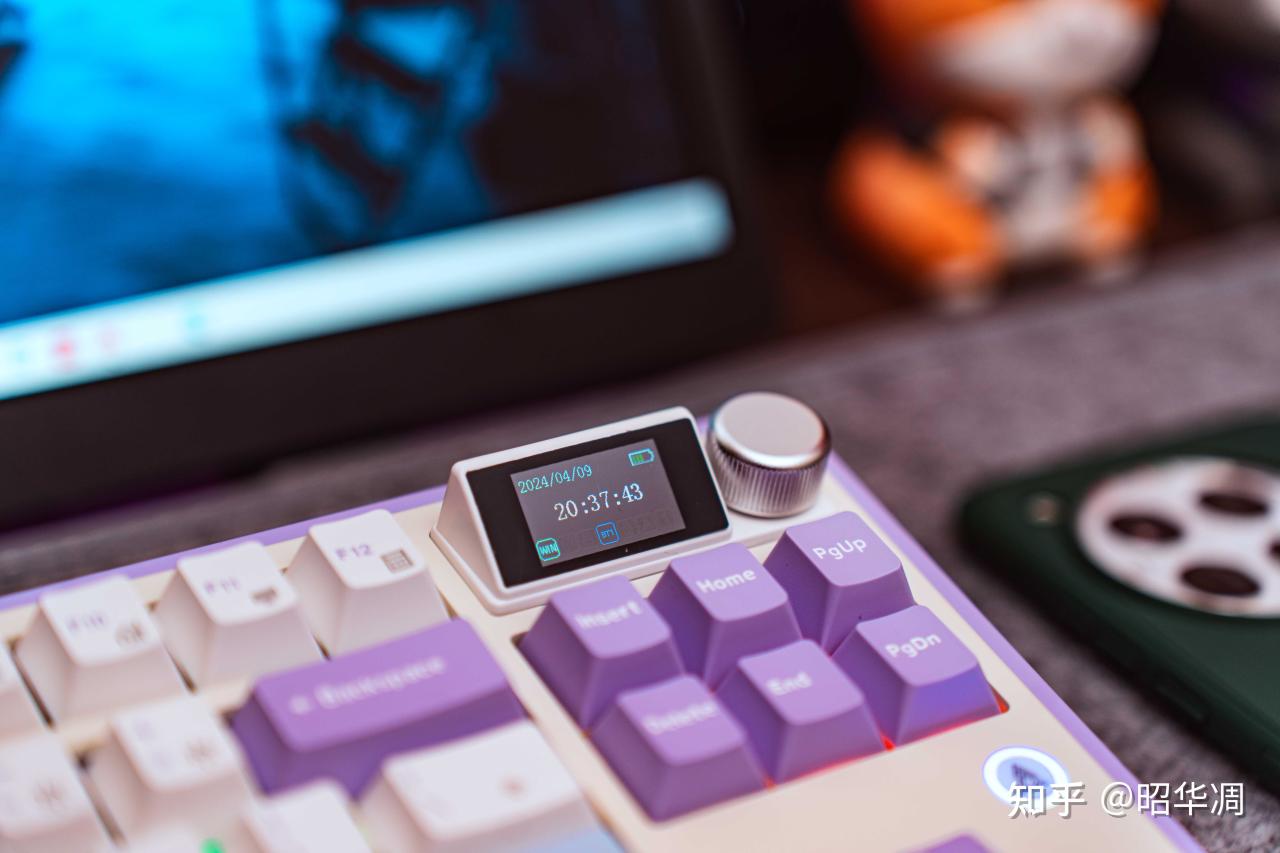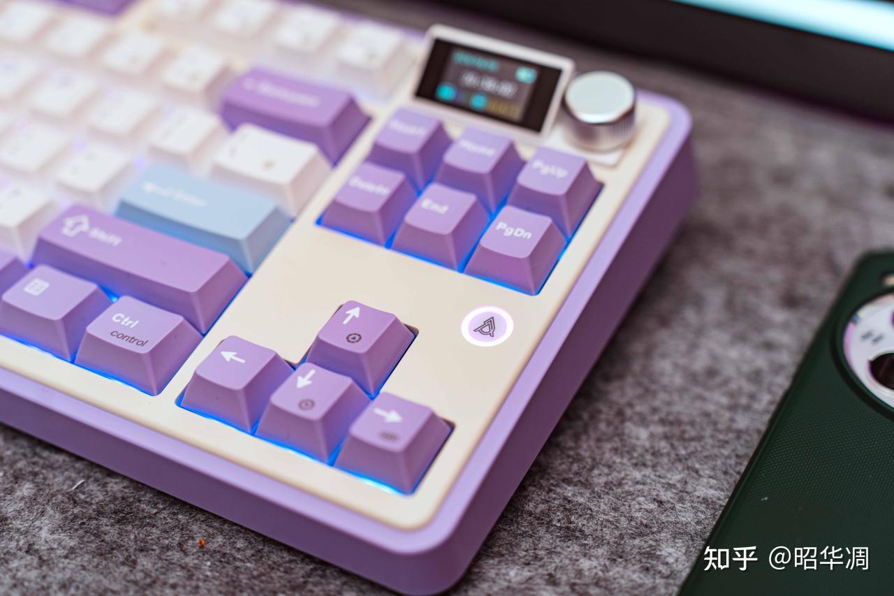 ▼键盘采用白紫主色调,搭配蓝灰作为点缀,配合右上角银色的金属旋钮,满满小清新风格又带有一丝科幻风,别说还挺符合我的审美。